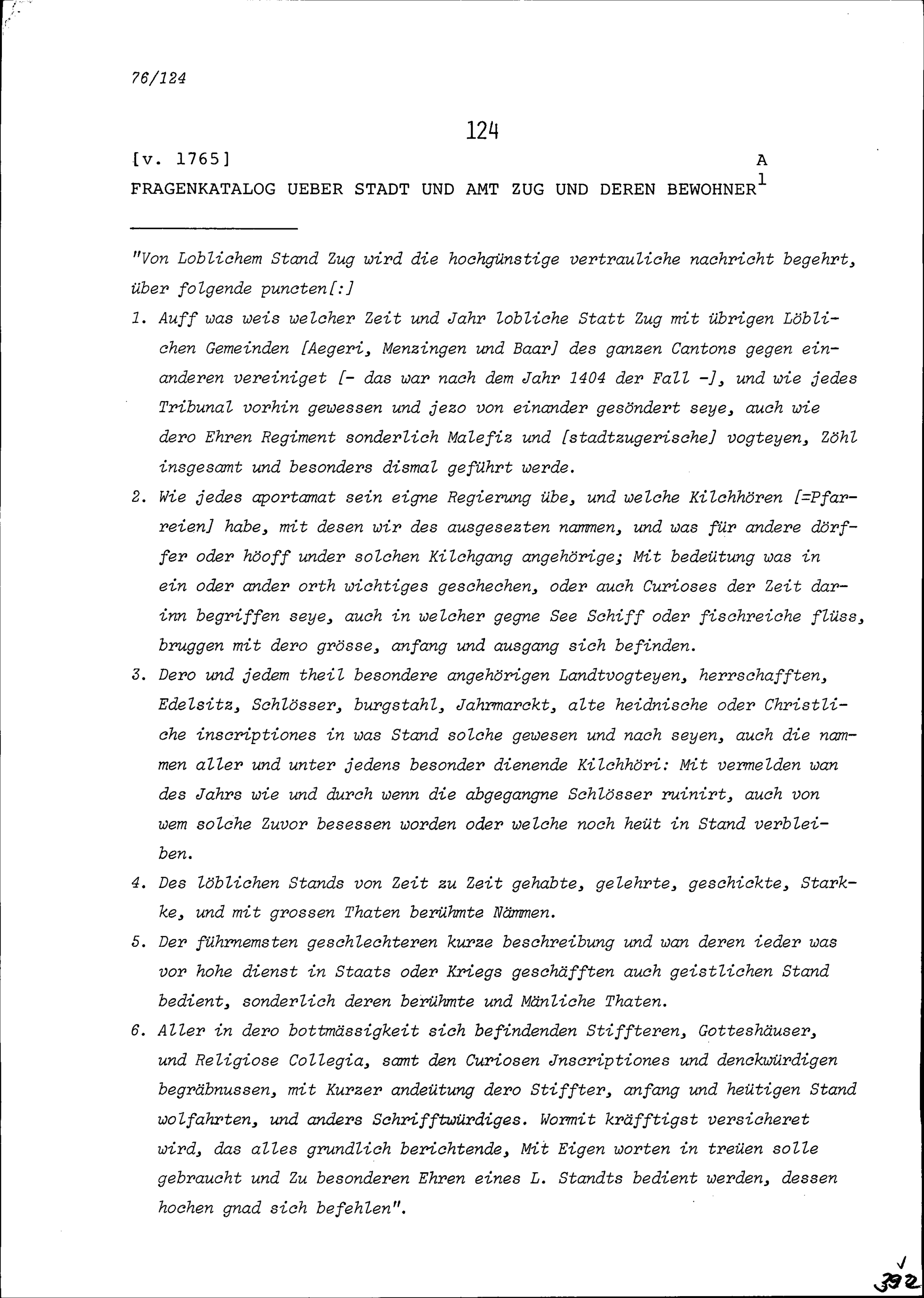 Allgemeiner Fragenkatalog über Stadt und Amt Zug und deren Bewohner wohl im Hinblick...