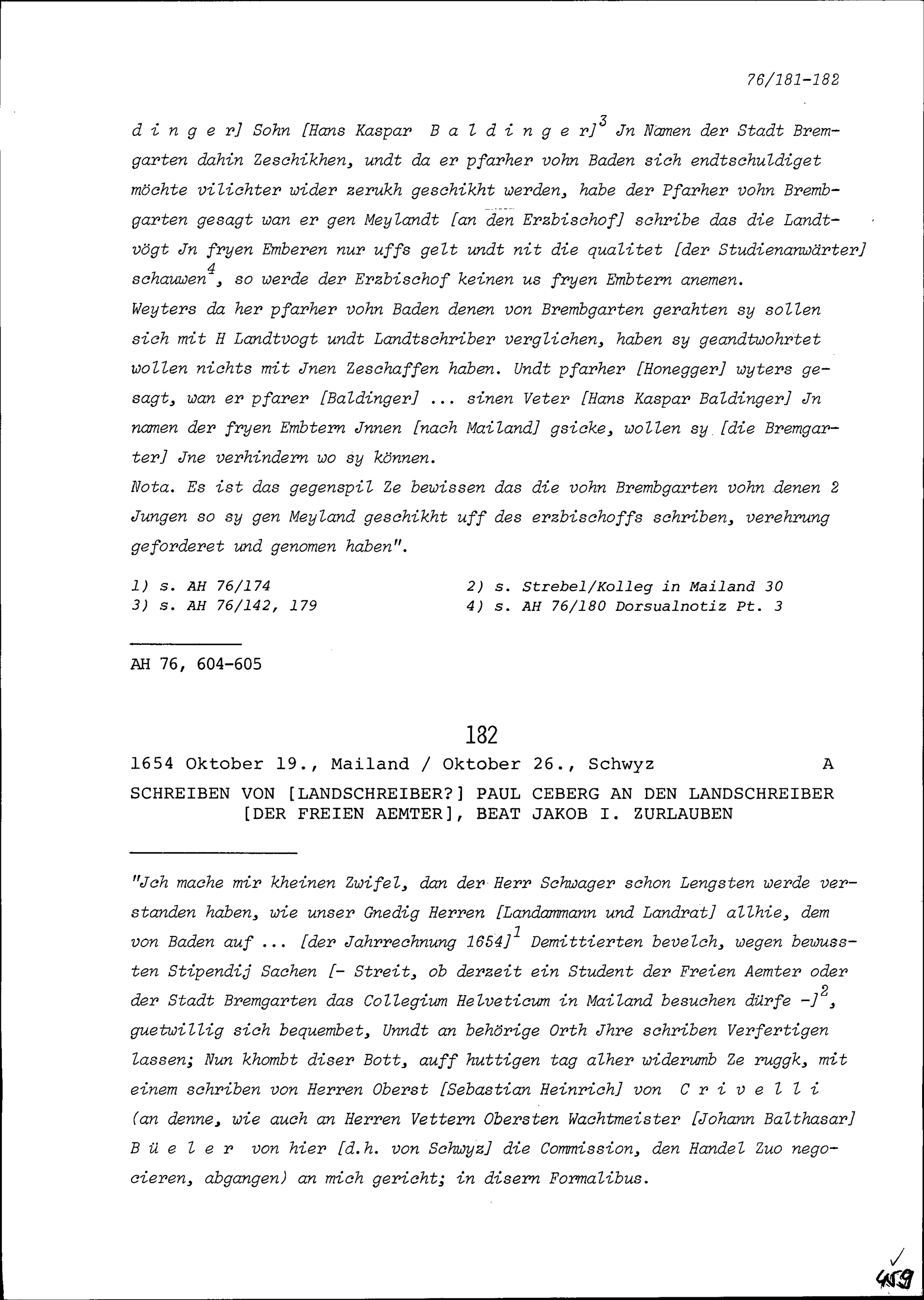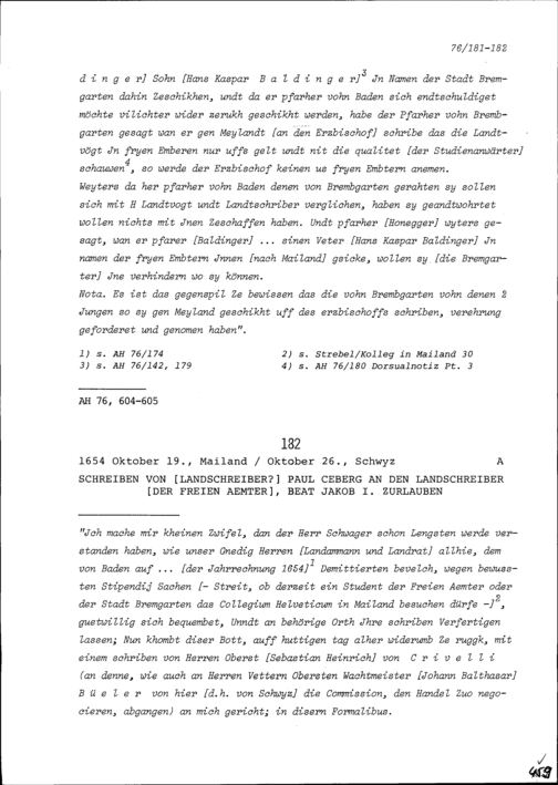 Schreiben von Paul Ceberg, Landschreiber, an Beat Jakob I. Zurlauben, Landschreiber der Freien Ämter