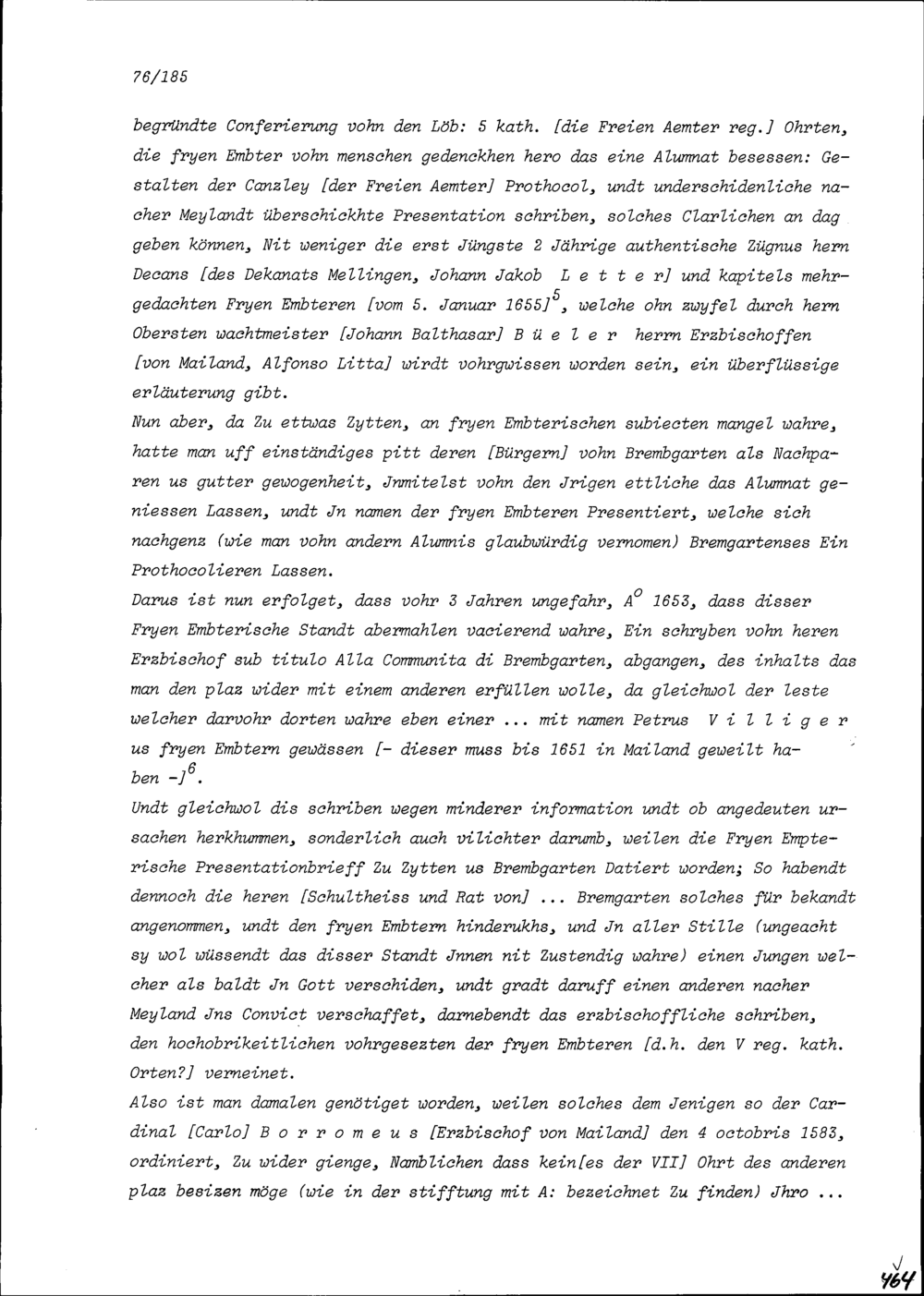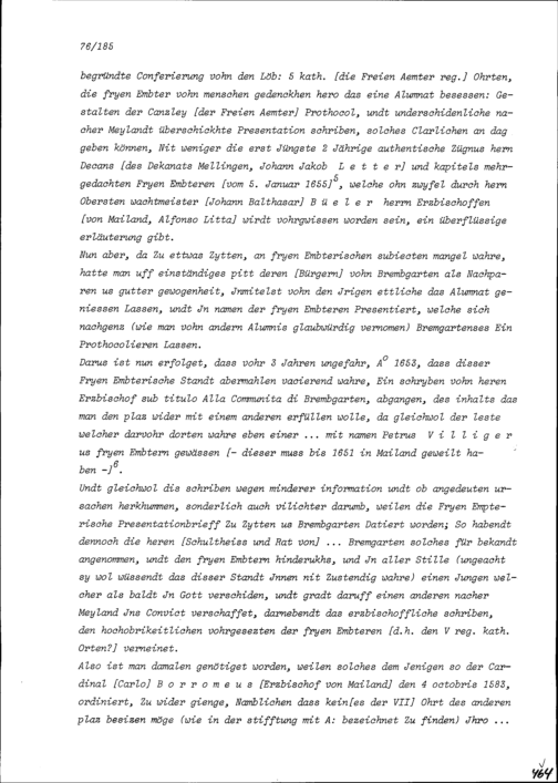Bericht betreffend der den Freien Ämter zustehenden Studienplätzen am Kollegium Helveticum in Mailand für Alfonso Litta, Erzbischof von Mailand, verfasst von Beat Jakob I. Zurlauben, Landschreiber