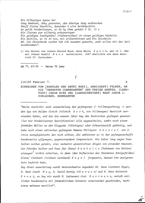 Schreiben von Arbogast Felber, Kanzler der Abtei Muri, an Jakob Wirz, Landvogt, und an Beat Jakob I. Zurlauben, Landschreiber, Bremgarten