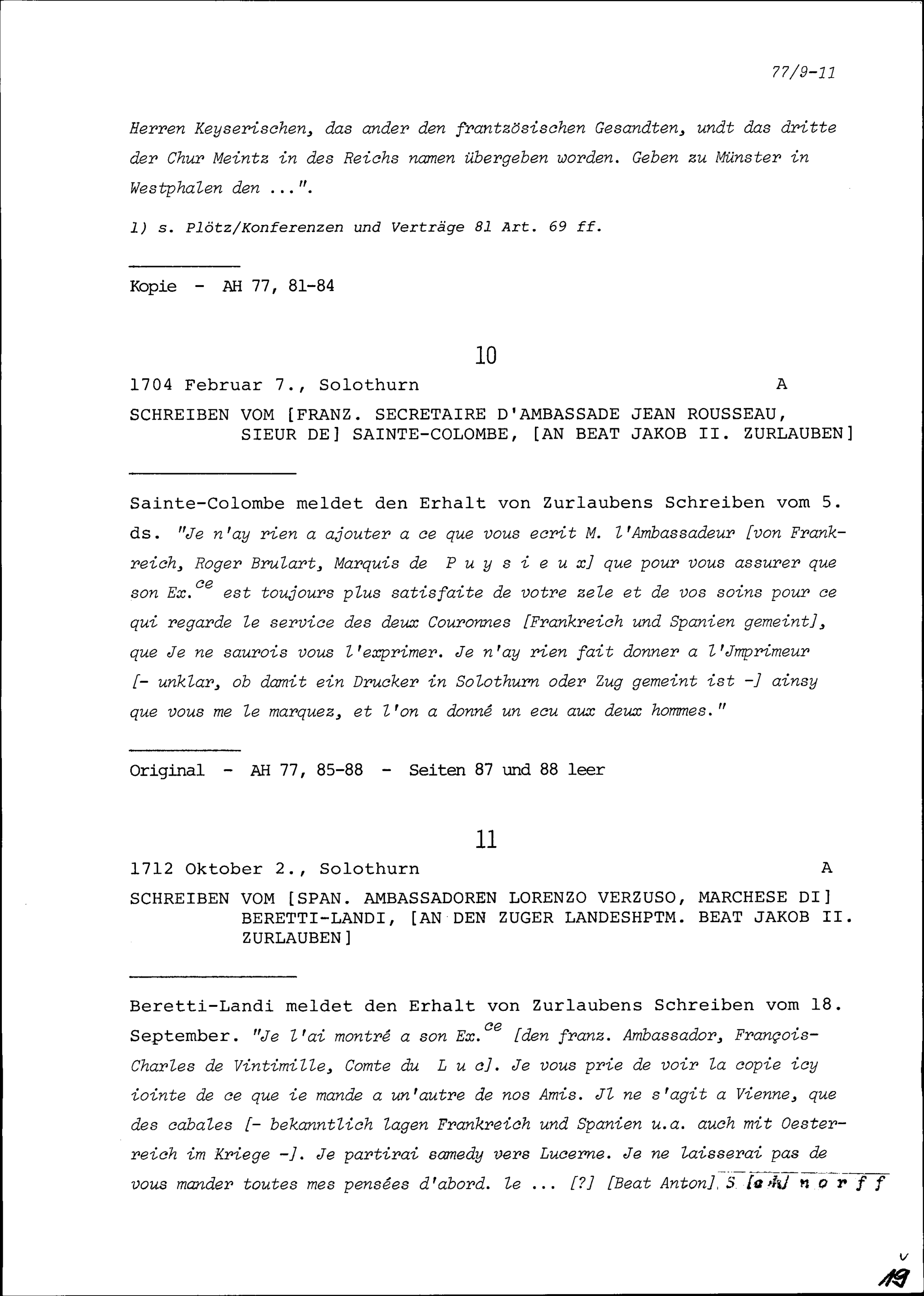 Schreiben von Jean Rousseau, Sieur de Sainte-Colombe, Botschaftssekretär von Frankreich, an Beat Jakob II. Zurlauben