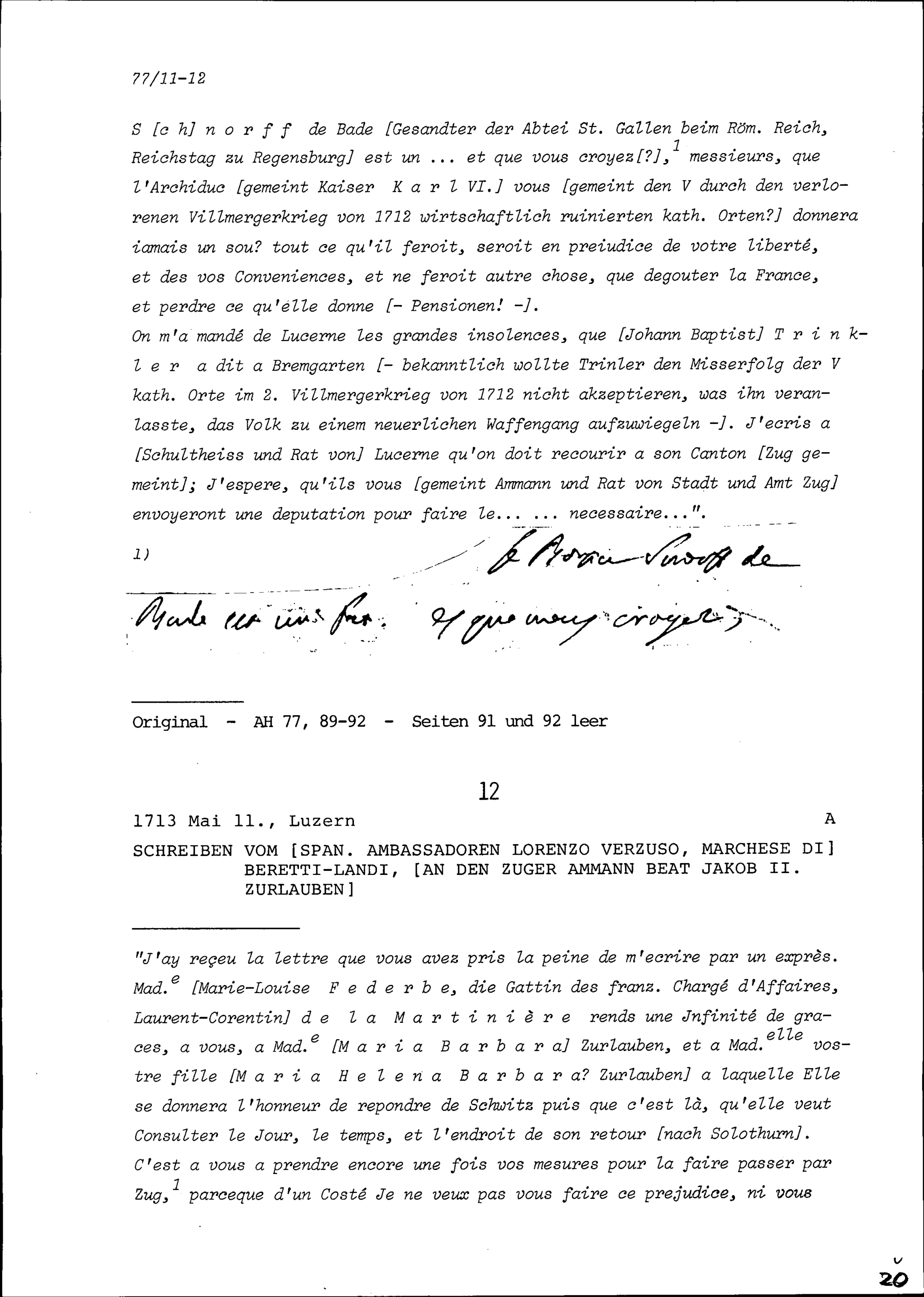Schreiben von Lorenzo Verzuso, Marchese di Beretti-Landi, Ambassador von Spanien, an Beat Jakob II. Zurlauben, Ammann