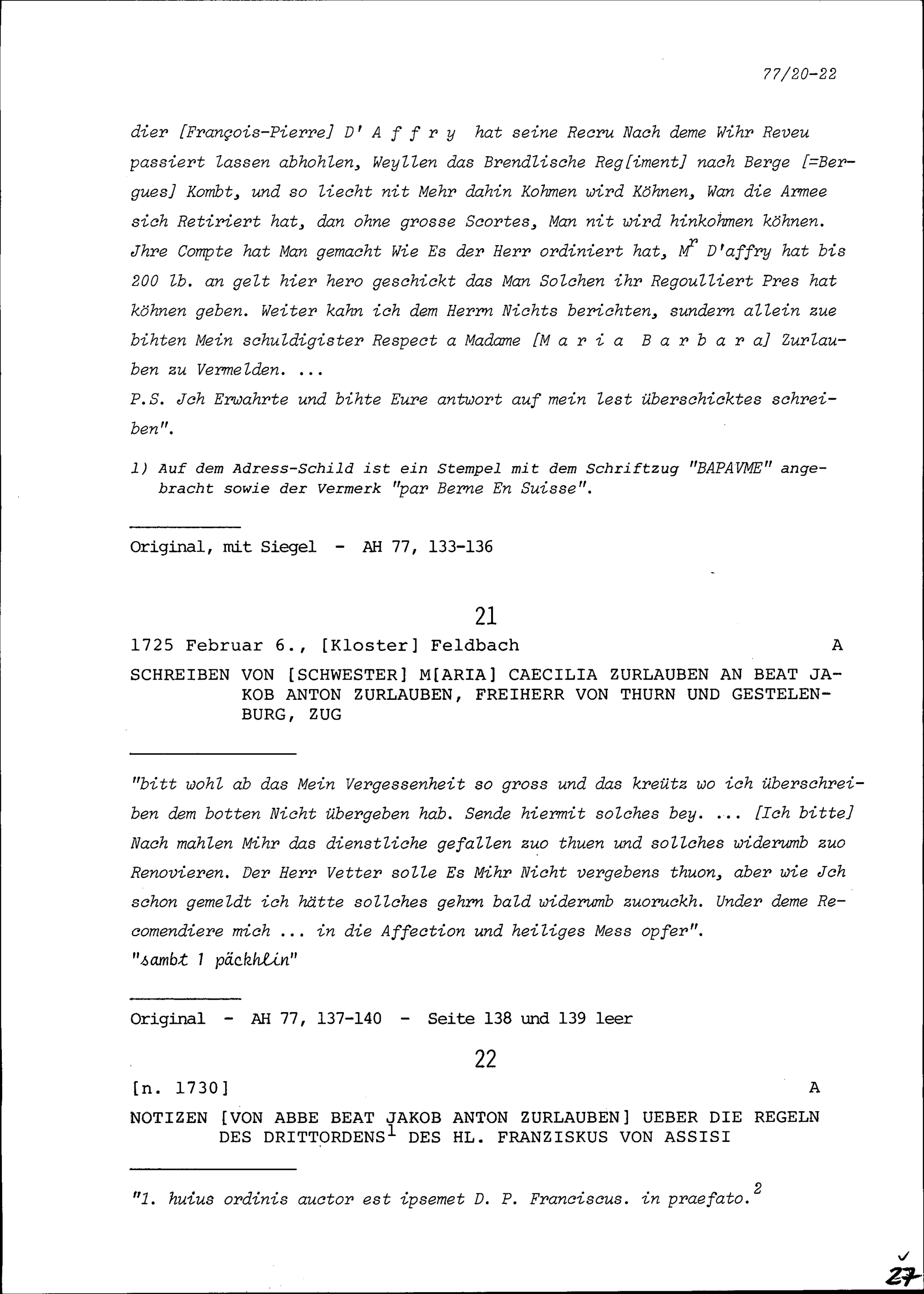 Schreiben von Maria Cäcilia Zurlauben, Klosterfrau, an Beat Jakob Anton Zurlauben, Zug