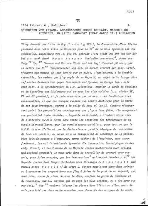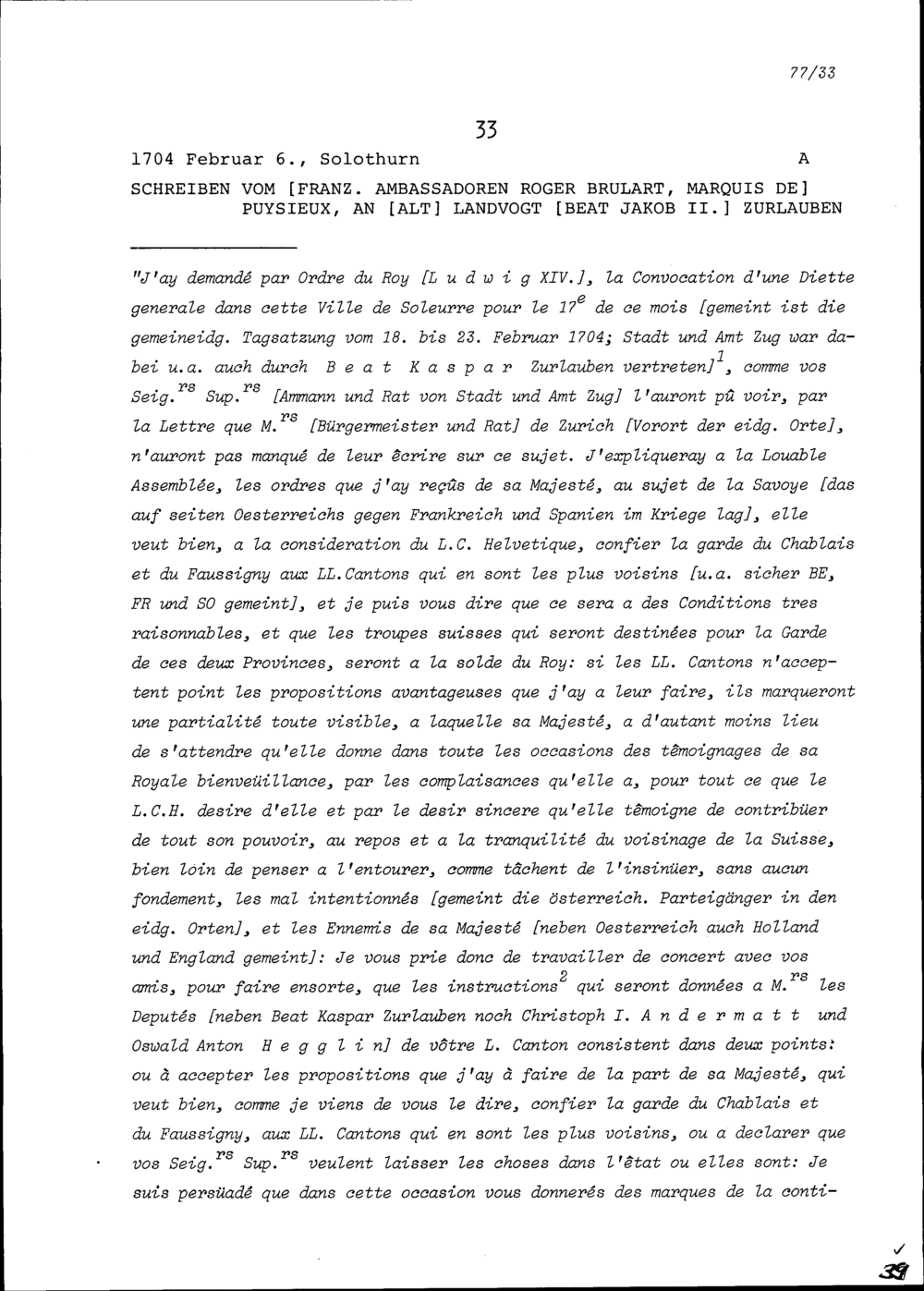 Schreiben von Roger Brûlart, Marquis de Puysieux, Ambassador von Frankreich, an Beat Jakob II. Zurlauben, Altlandvogt