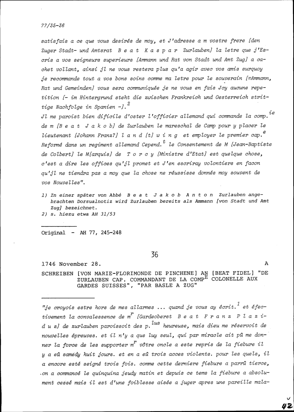 Schreiben von Marie-Florimonde de Pinchène an Beat Fidel Zurlauben, Zug