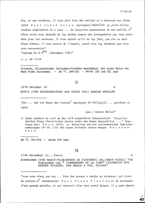 Notiz von Damian Müller, Seckelmeister der Stadt Zug