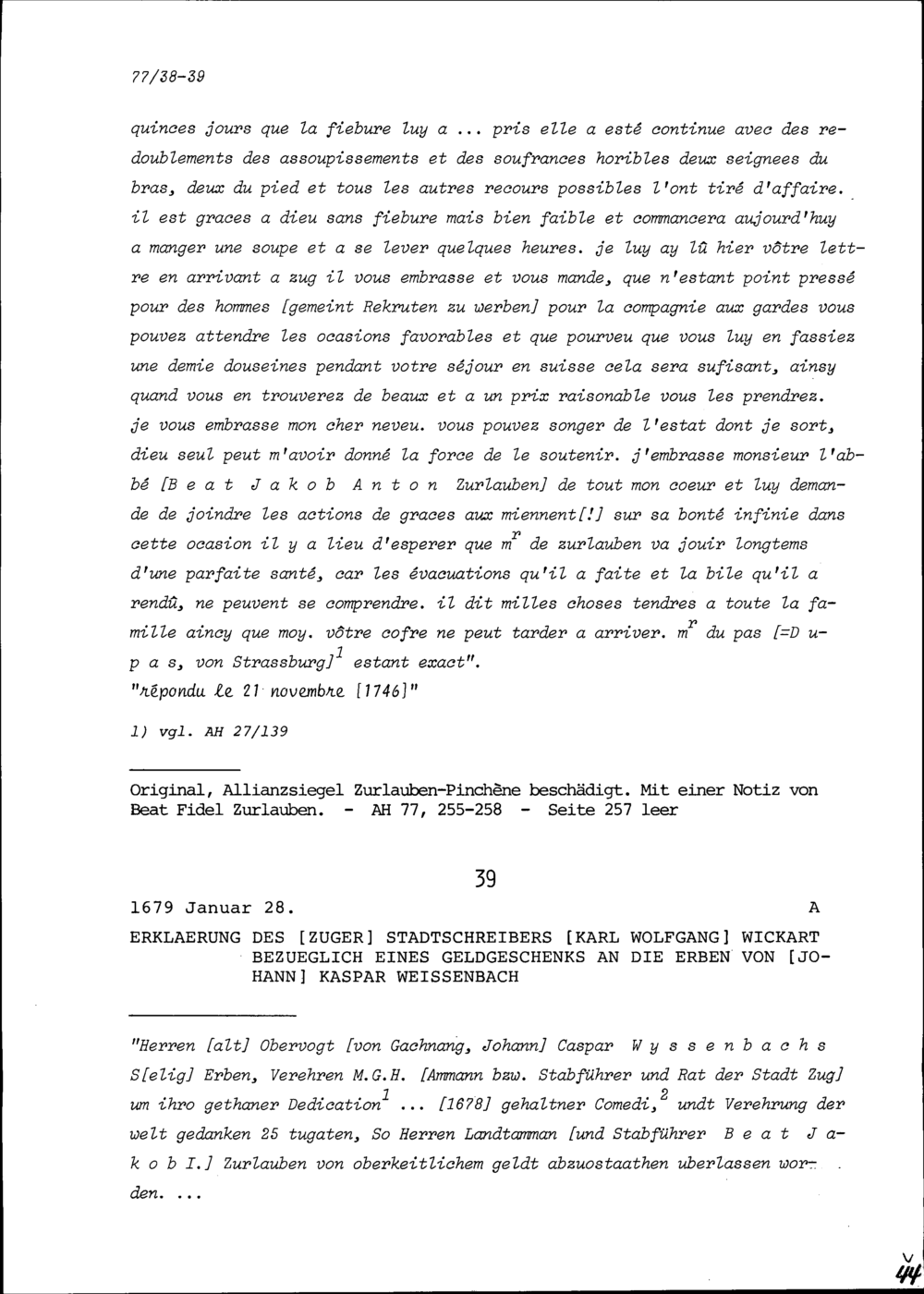 Erklärung von Karl Wolfgang Wickart, Zuger Stadtschreiber, bezüglich eines Geldgeschenks an die Erben von Johann Kaspar Weissenbach