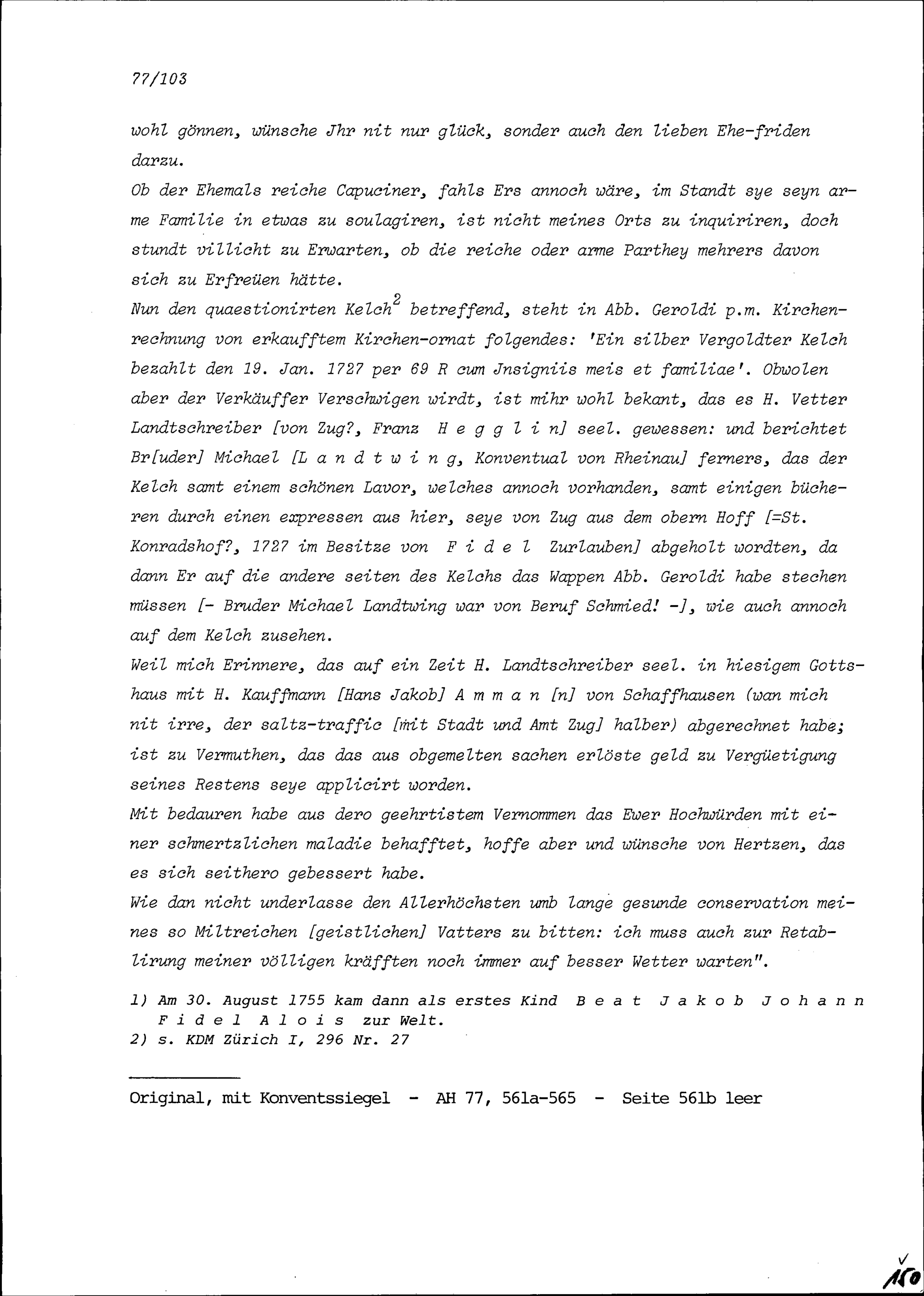 Schreiben von Gerold Müller, Konventuale, an Beat Jakob Anton Zurlauben, Priester, Zug