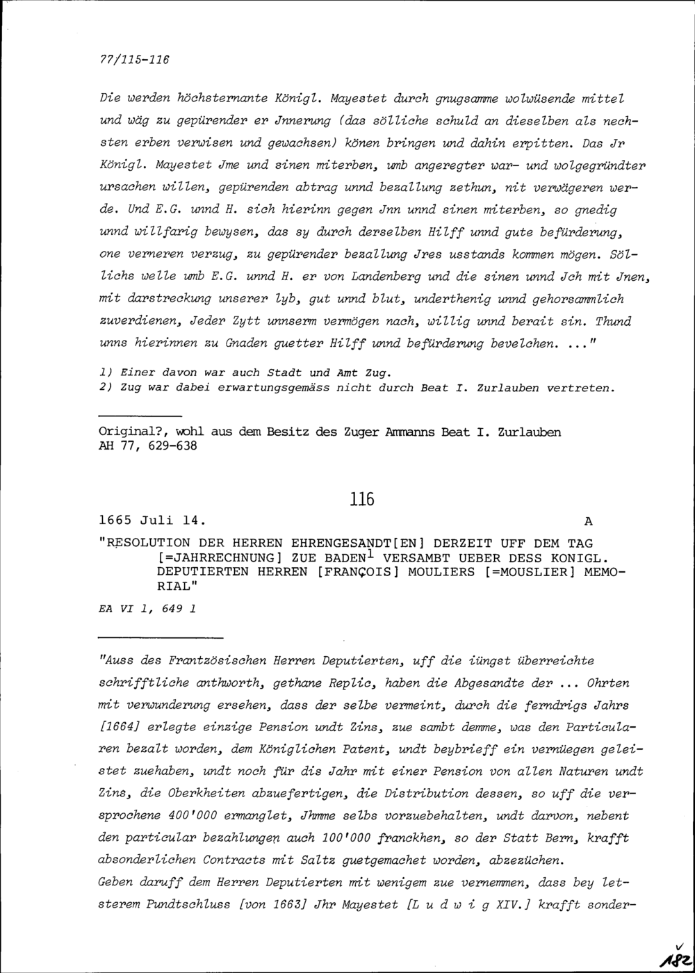 Resolution der Gesandten an der Jahrrechnung in Baden auf den Bericht von François Mouslier, Gesandter des Königs