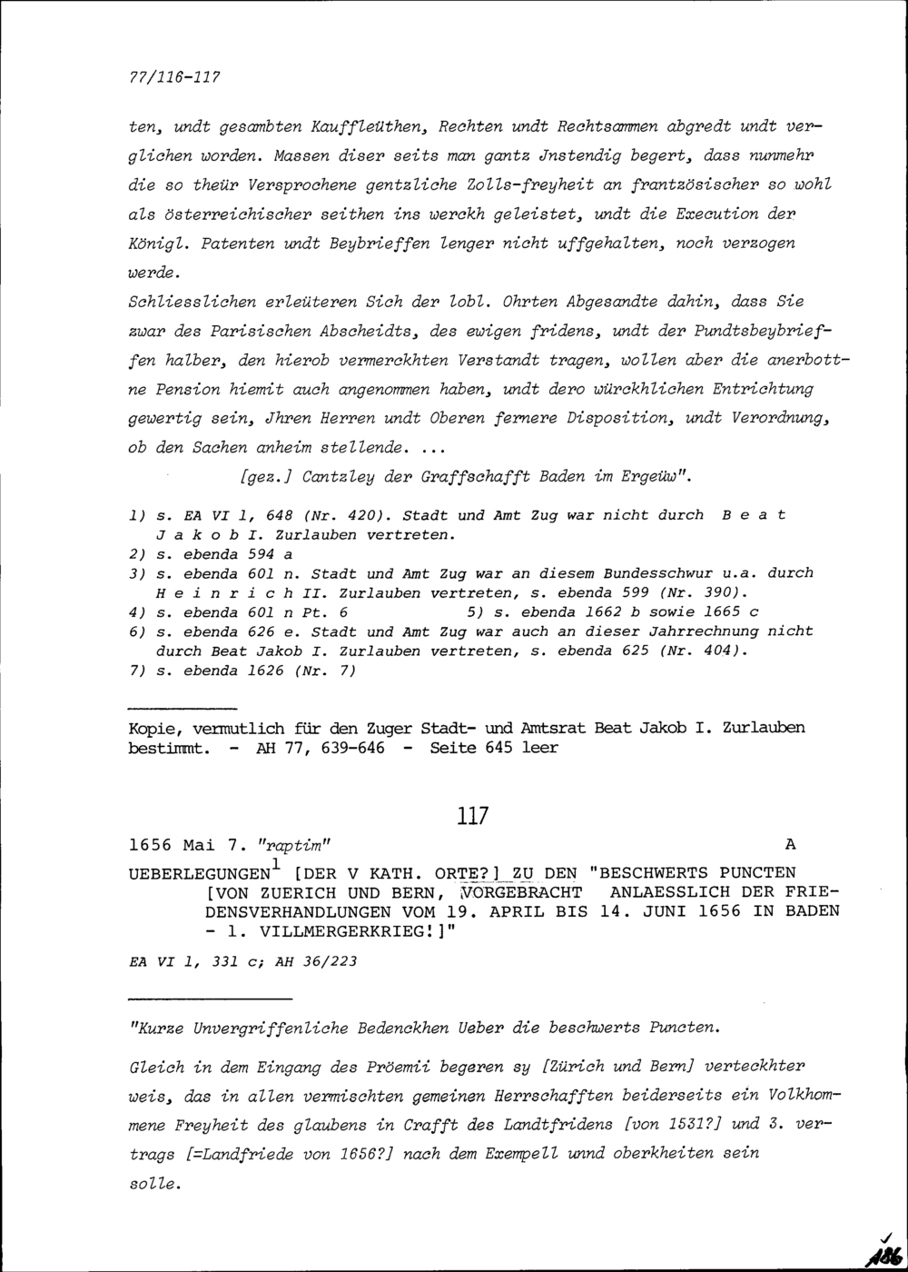 Überlegungen der Fünf Katholischen Orte zu den Beschwerden von Zürich und Bern, bei den Friedensverhandlungen vom 19. April bis 14. Juni 1656 in Baden
