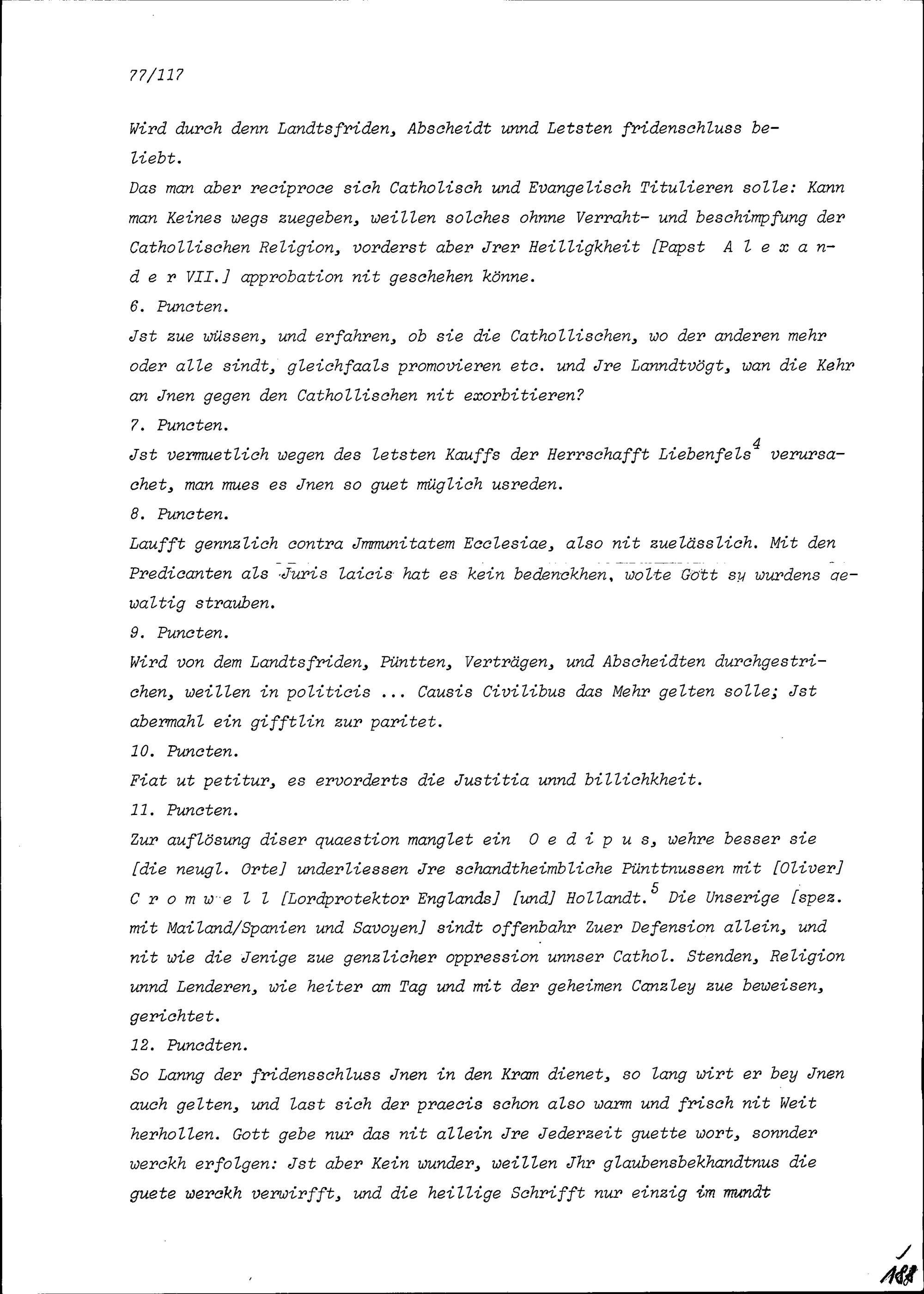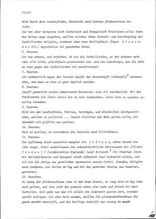 Überlegungen der Fünf Katholischen Orte zu den Beschwerden von Zürich und Bern, bei den Friedensverhandlungen vom 19. April bis 14. Juni 1656 in Baden