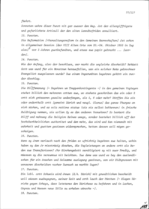 Überlegungen der Fünf Katholischen Orte zu den Beschwerden von Zürich und Bern, bei den Friedensverhandlungen vom 19. April bis 14. Juni 1656 in Baden