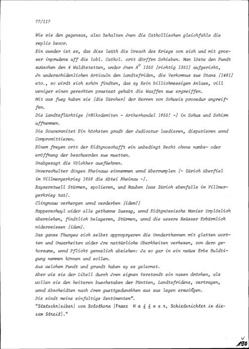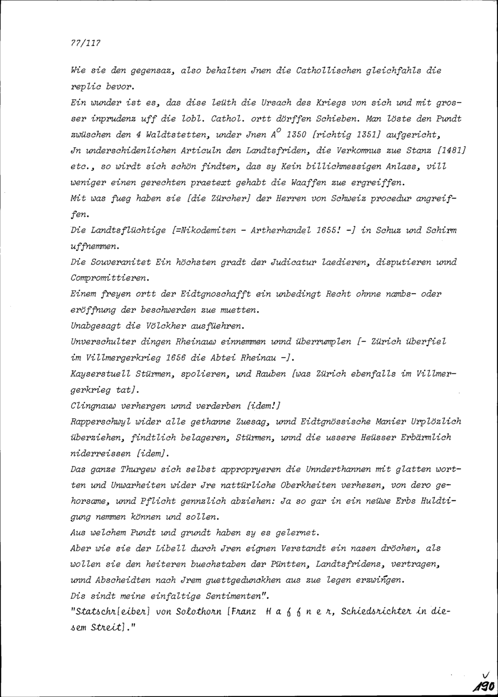 Überlegungen der Fünf Katholischen Orte zu den Beschwerden von Zürich und Bern, bei den Friedensverhandlungen vom 19. April bis 14. Juni 1656 in Baden
