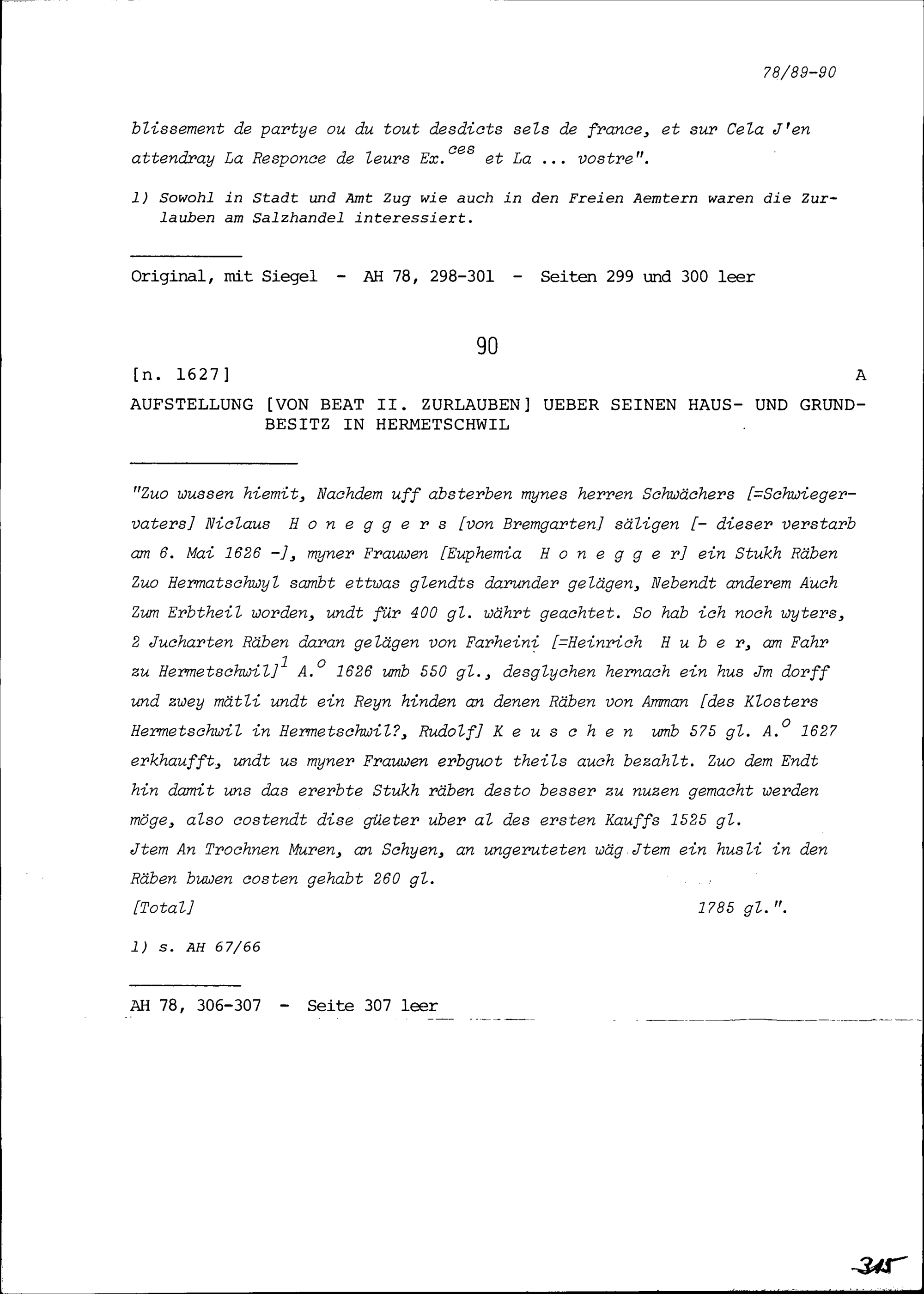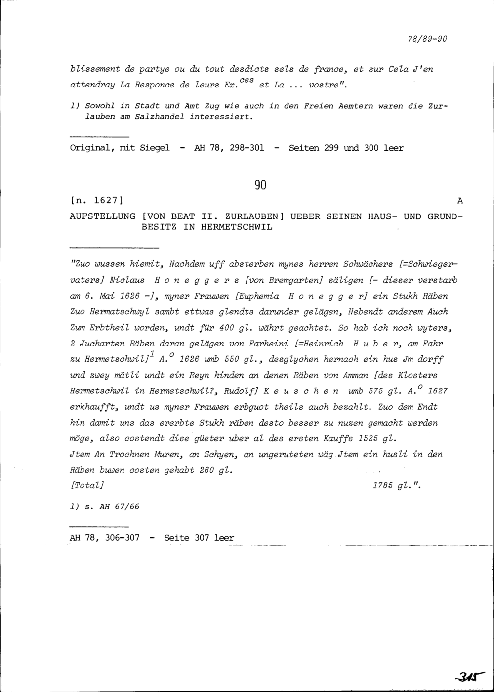 Aufstellung von Beat II. Zurlauben über seinen Haus- und Grundbesitz in Hermetschwil