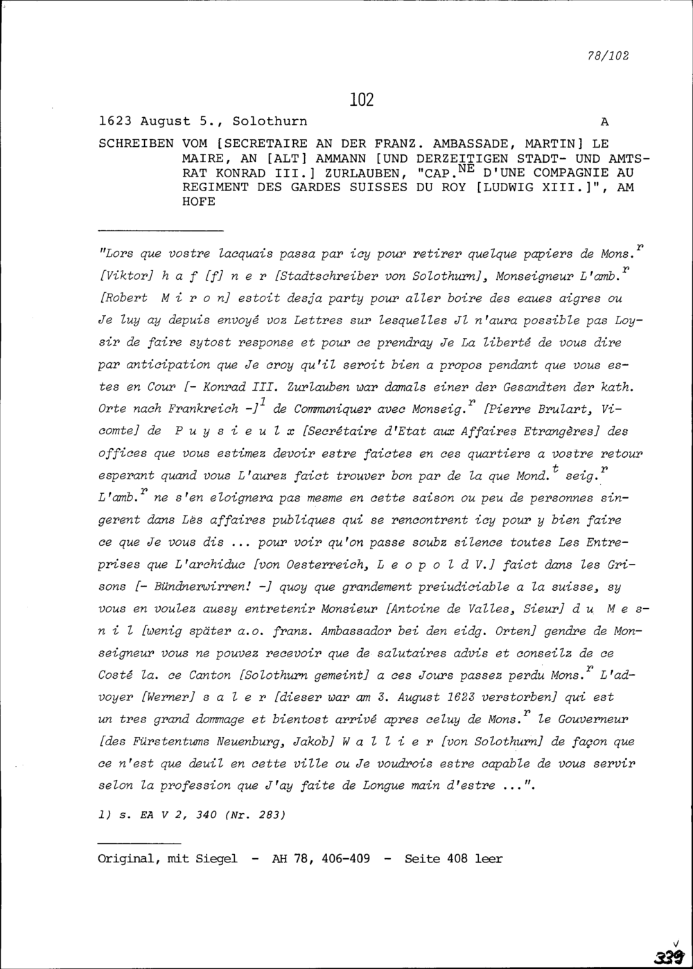 Schreiben von Martin Le Maires, Sekretär an der französischen Ambassade, an Konrad III. Zurlauben, Hauptmann, Altammann und Stadt- und Amtrat, am Hof in Paris