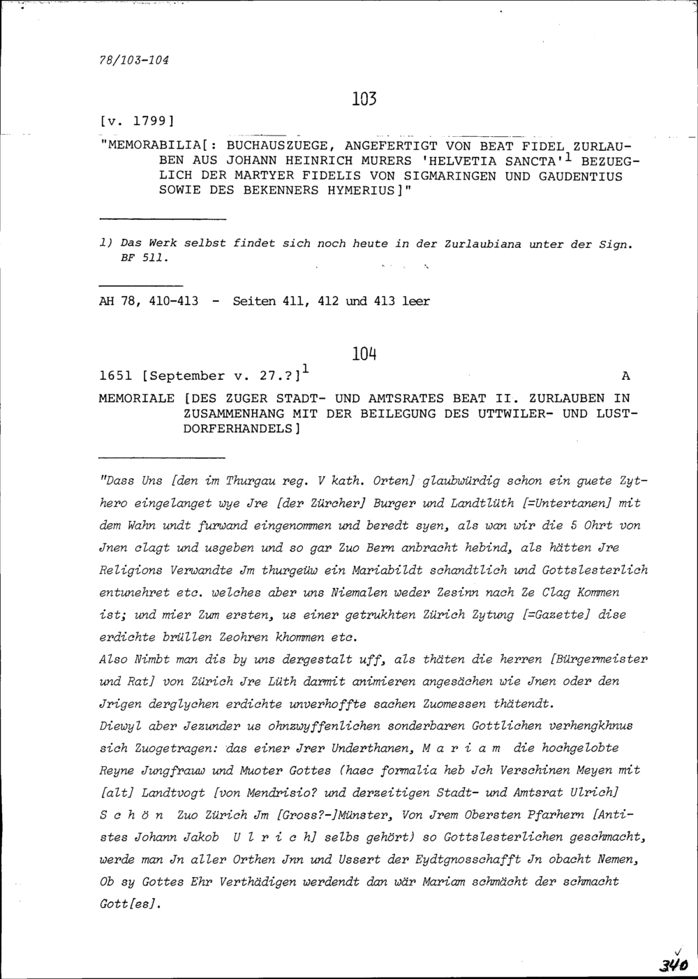 Buchauszüge von Beat Fidel Zurlauben aus: Johann Heinrich Murers Helvetia sancta