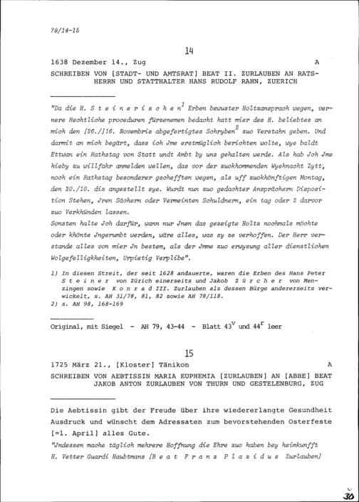 Schreiben von Beat II. Zurlauben, Stadt- und Amtrat, an Hans Rudolf Rahn, Ratsherr und Statthalter, Zürich