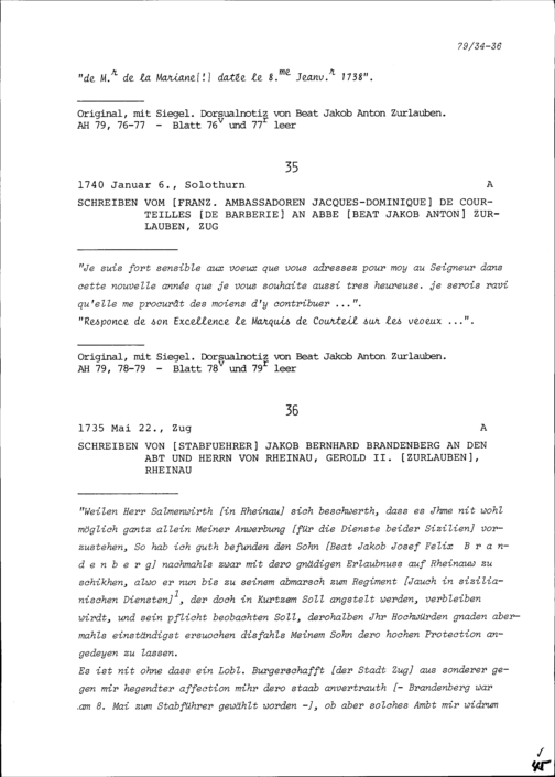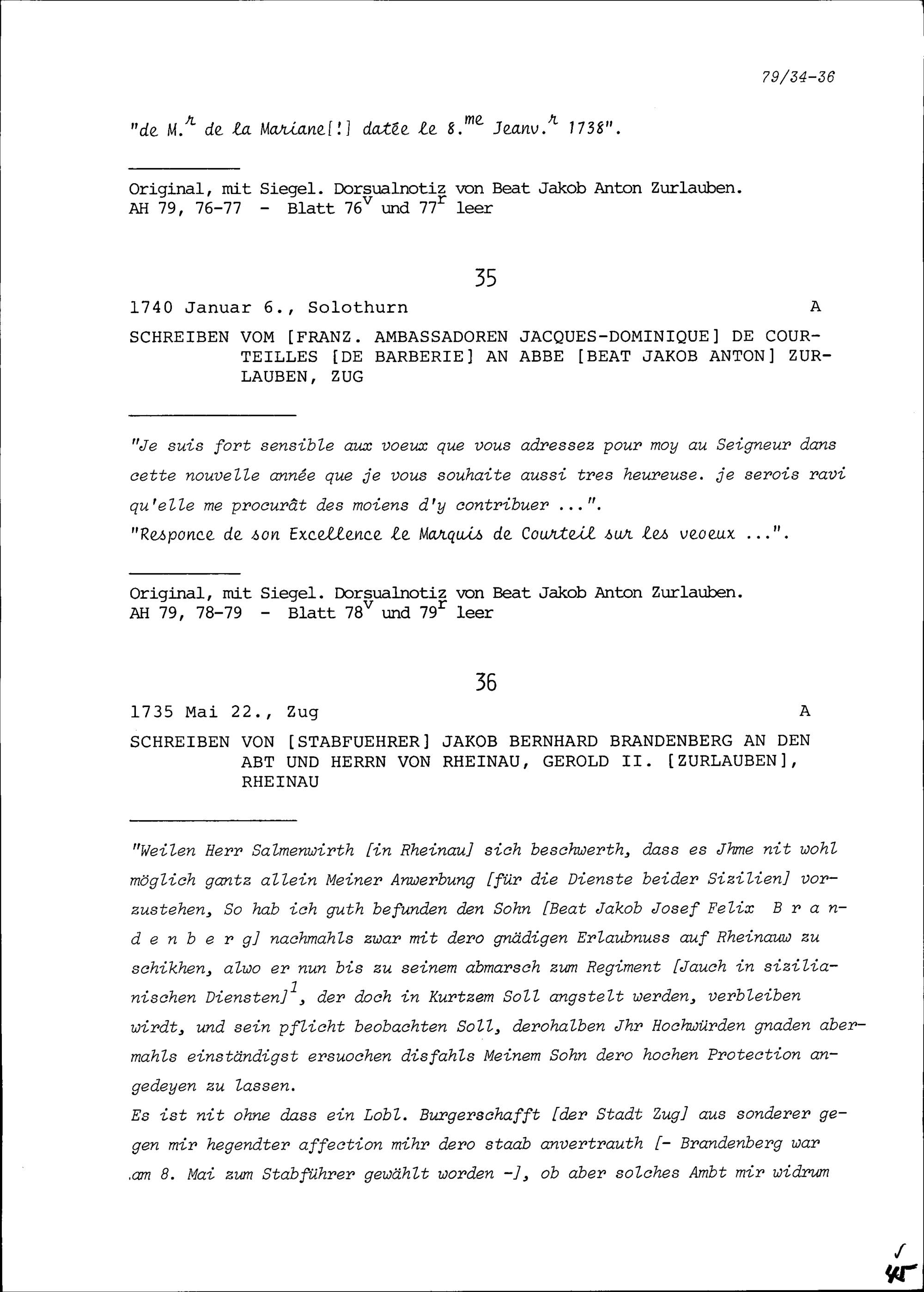 Schreiben von Jacques-Dominique de Courteilles de Barberie, Ambassador von Frankreich, an Beat Jakob Anton Zurlauben, Priester, Zug