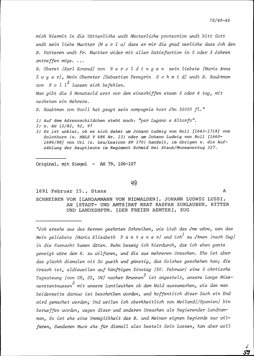 Schreiben von Johann Ludwig Lussi, Landammann von Nidwalden, an Beat Kaspar Zurlauben, Stadt- und Amtrat und Landeshauptmann der Freien Ämter, Zug