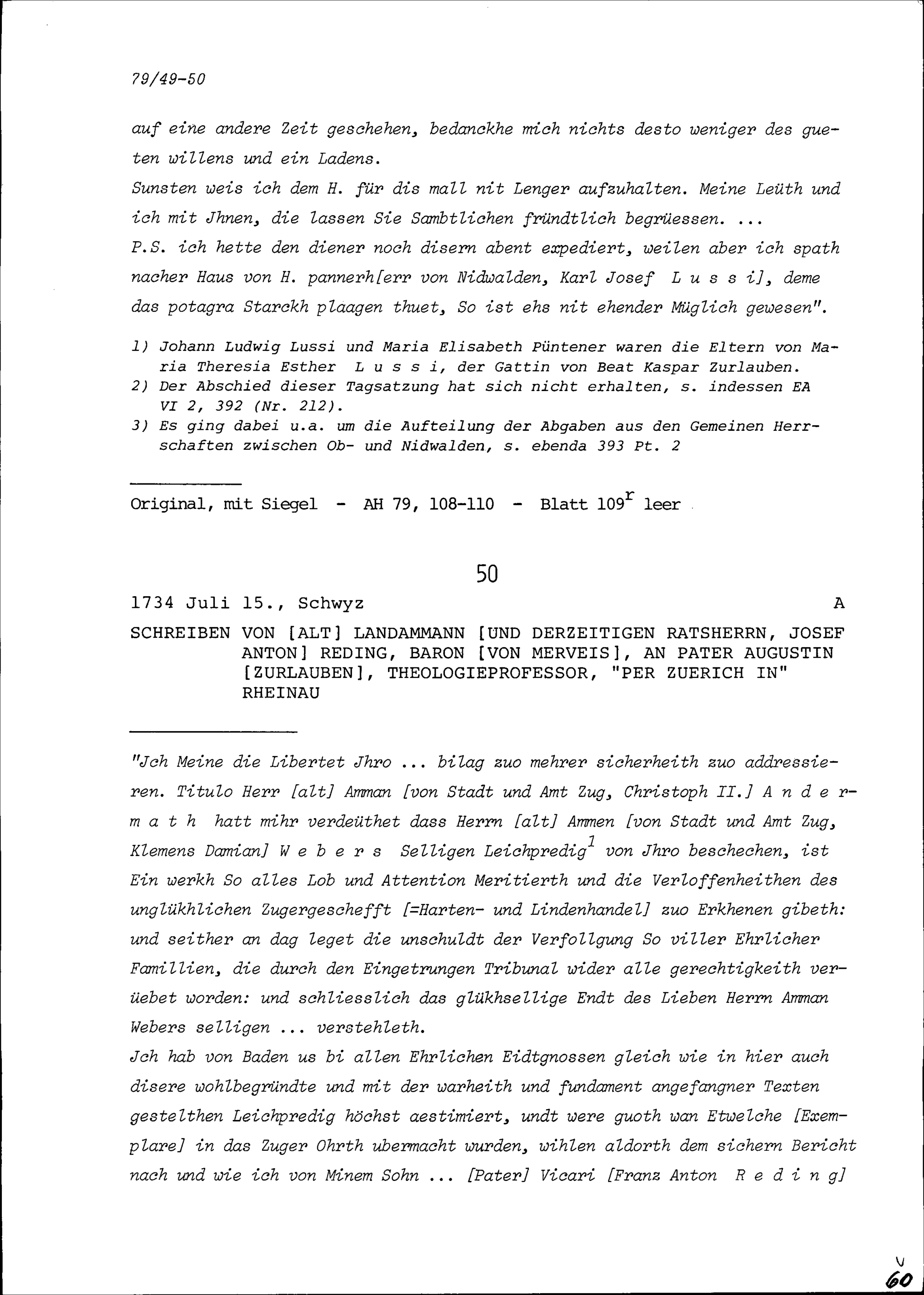 Schreiben von Josef Anton Reding, Baron von Merveis, Altlandammann und Ratsherrn, an Augustin Zurlauben, Konventuale und Theologieprofessor, Rheinau