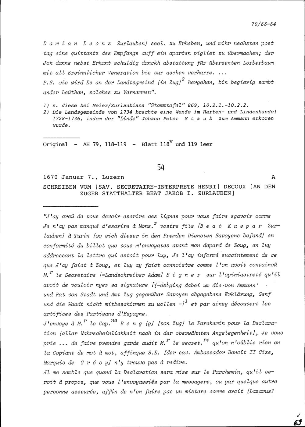 Schreiben von Henri Decoux, Dolmetscher von Savoyen, an Beat Jakob I. Zurlauben, Statthalter Zug
