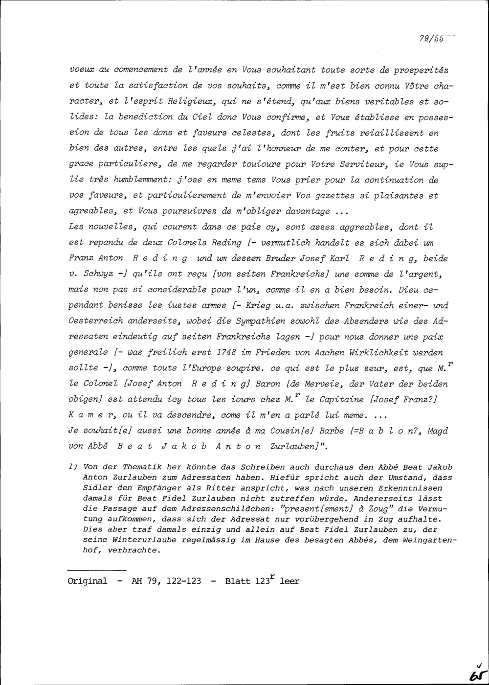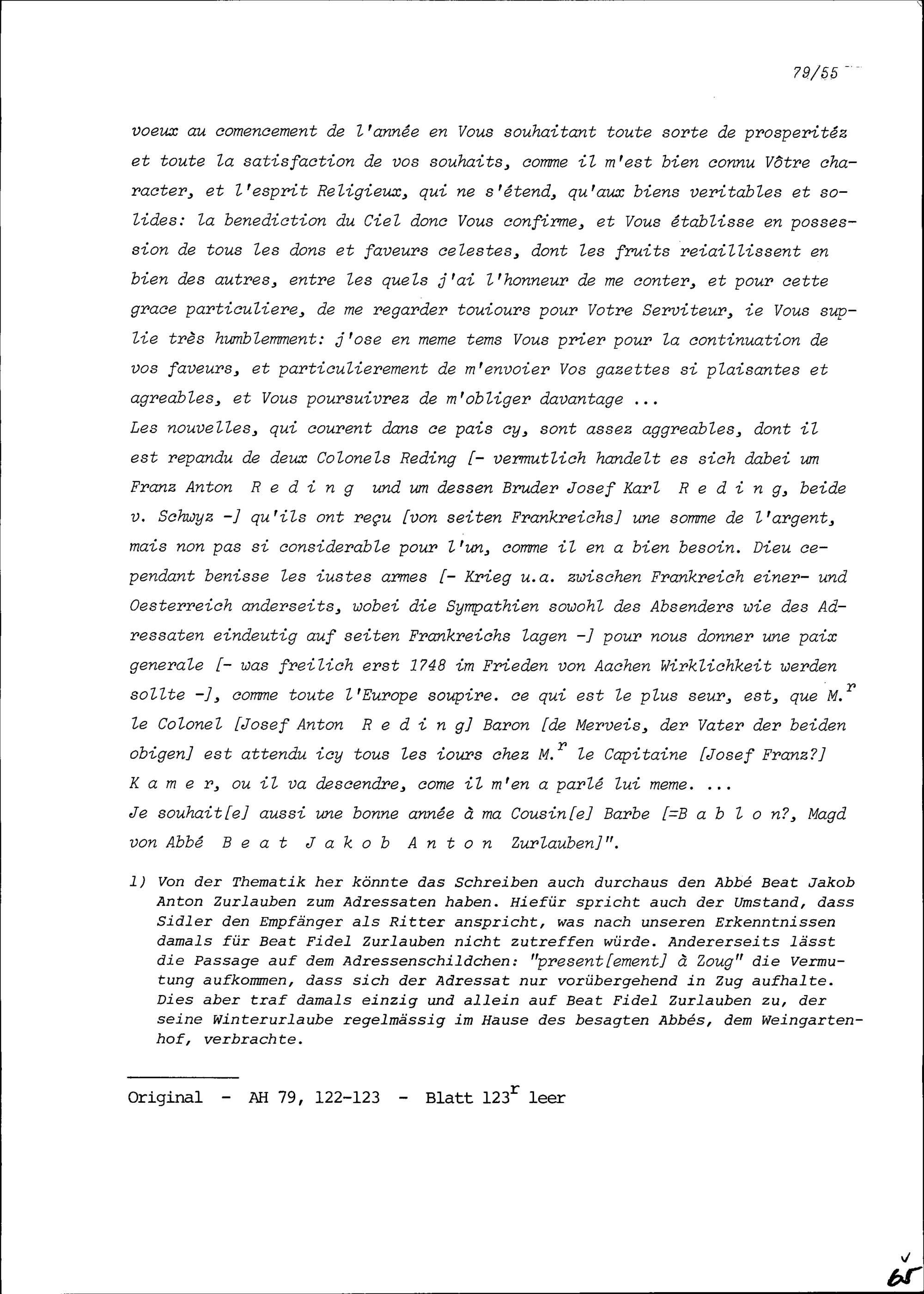 Schreiben von Damian Sidler, Kapuzinerpater und Guardian, an Beat Fidel Zurlauben, Zug