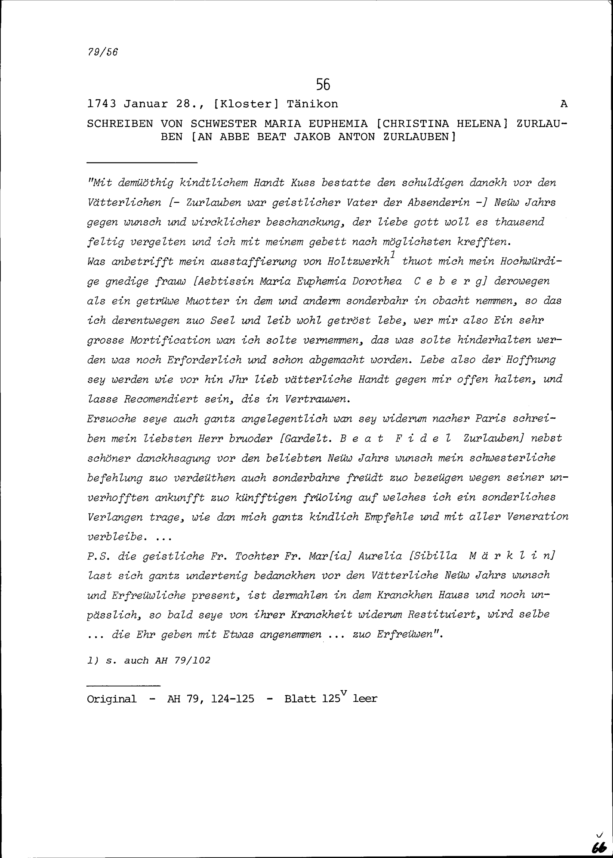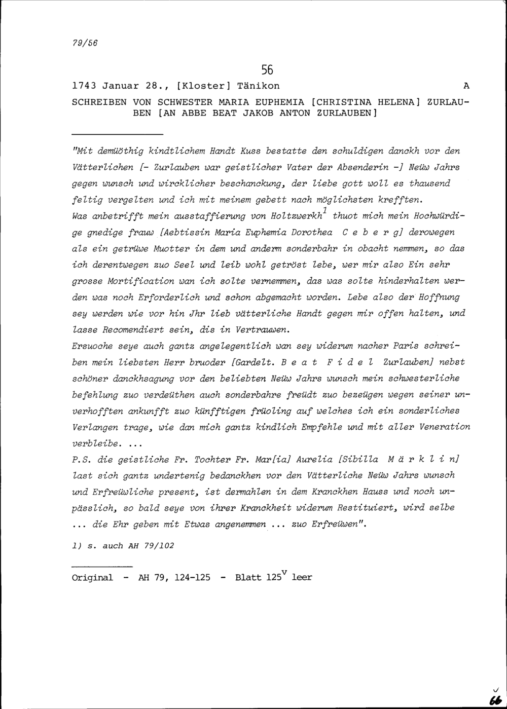Schreiben von Maria Euphemia Christina Helena Zurlauben, Klosterfrau in Tänikon, an Beat Jakob Anton Zurlauben, Priester