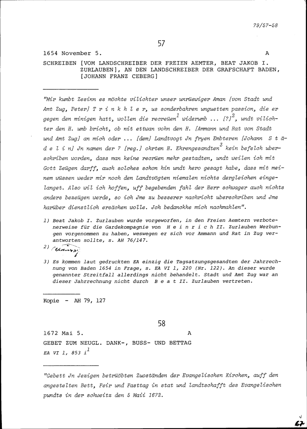 Schreiben von Beat Jakob I. Zurlauben, Landschreiber der Freien Ämter, an Johann Franz Ceberg, Landschreiber der Grafschaft Baden