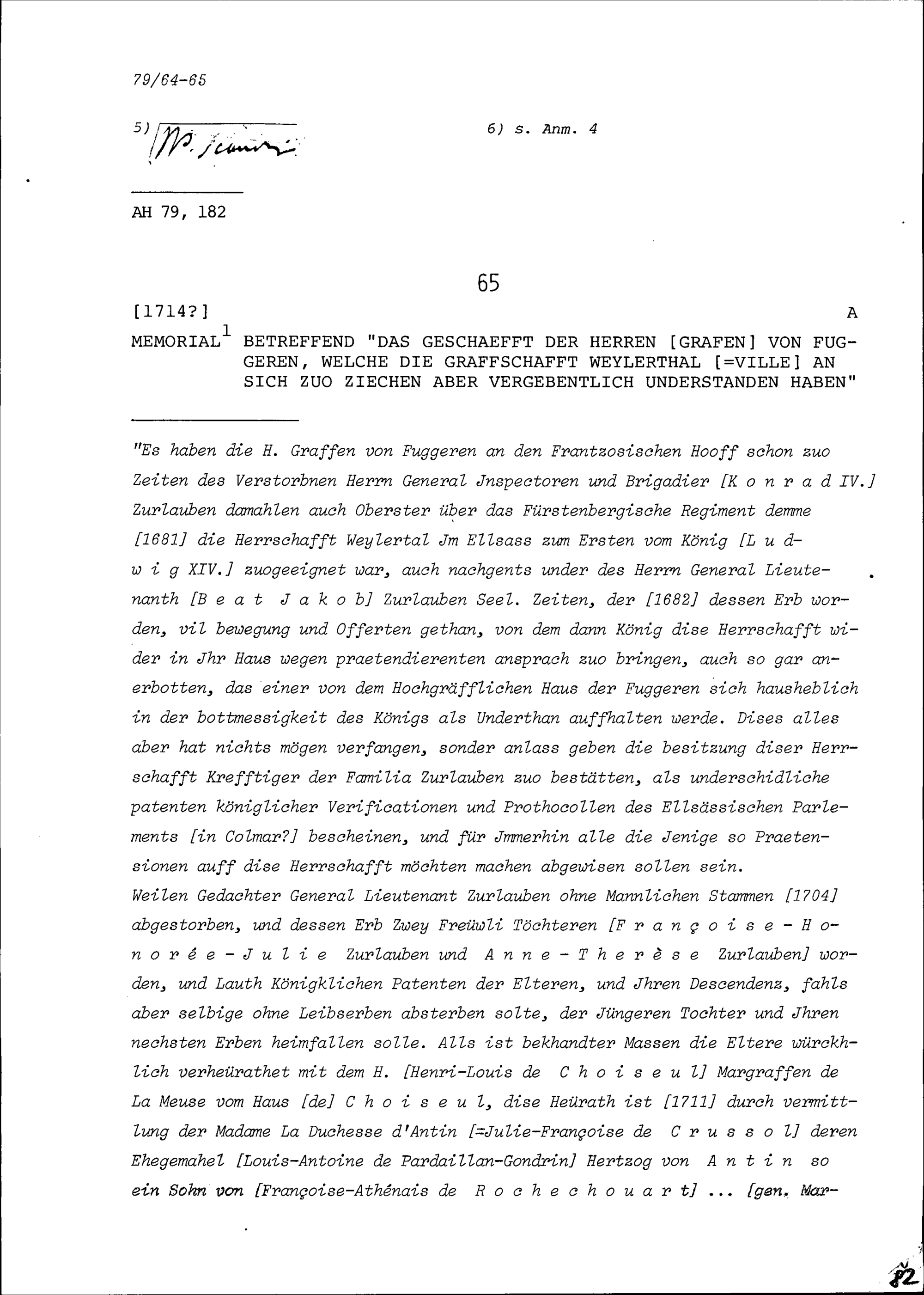Bericht wegen der Grafen von Fuggeren, welche die Grafschaft Wilerthal (= Ville) an sich ziehen wollten