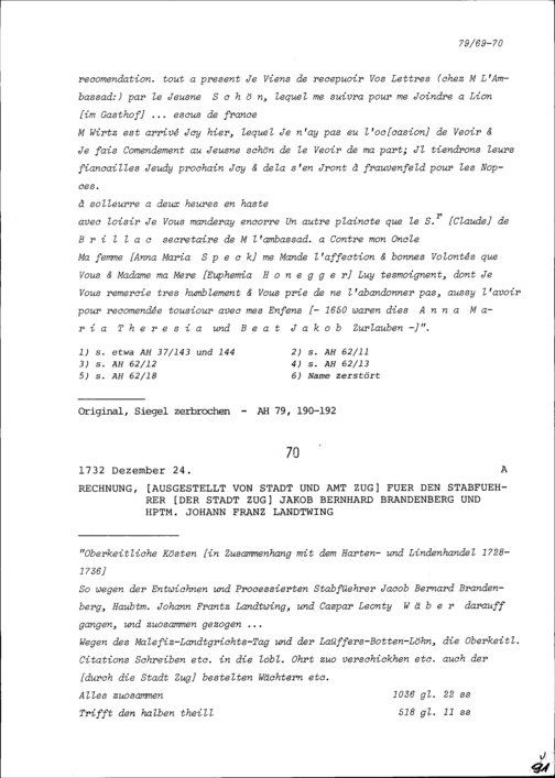 Rechnung für Jakob Bernhard Brandenberg, Stabführer der Stadt Zug, und für Johann Franz Landtwing, Hauptmann, ausgestellt von Stadt und Amt Zug