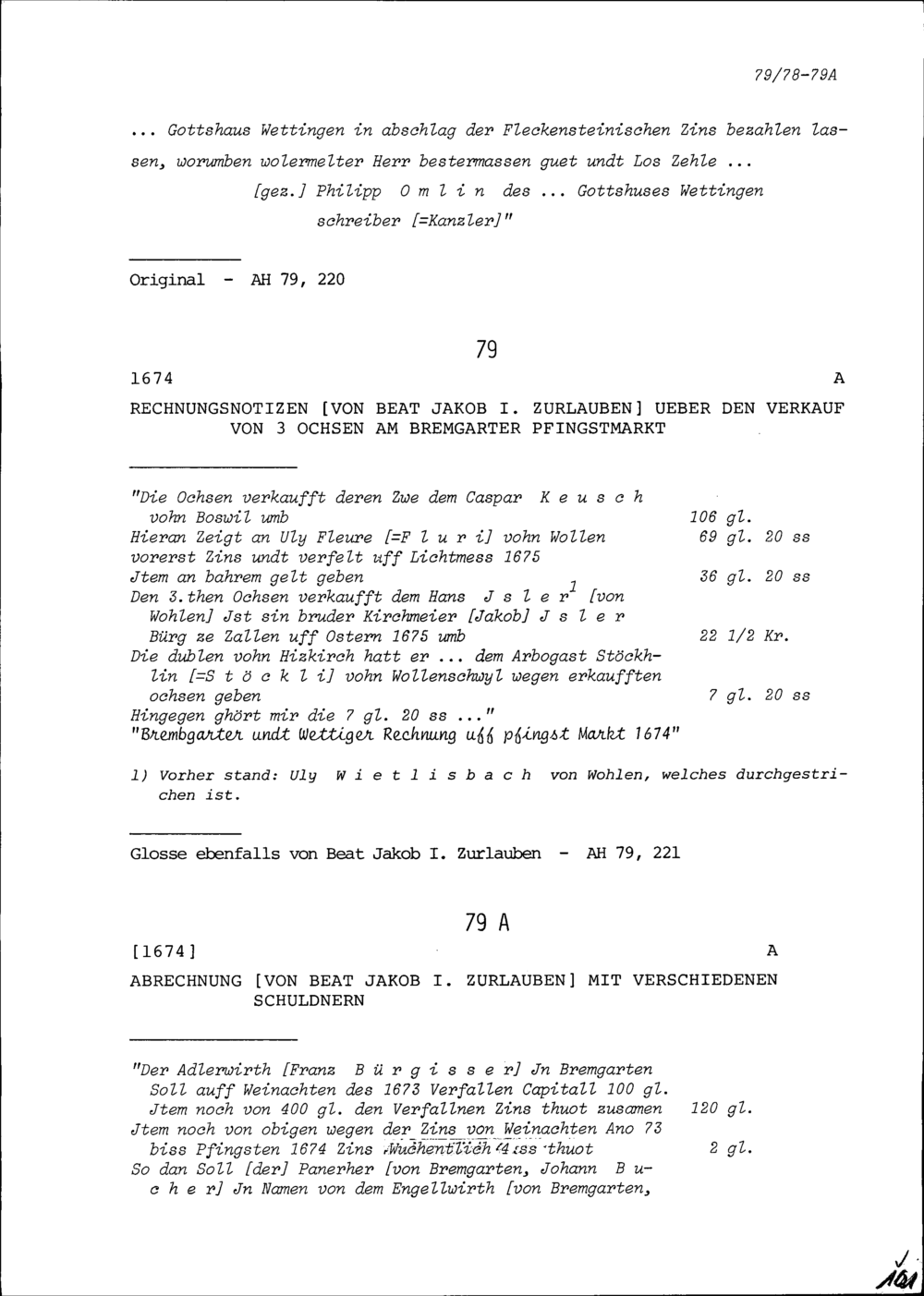 Rechnungsnotizen von Beat Jakob I. Zurlauben über den Verkauf von drei Ochsen am Bremgarter Pfingstmarkt