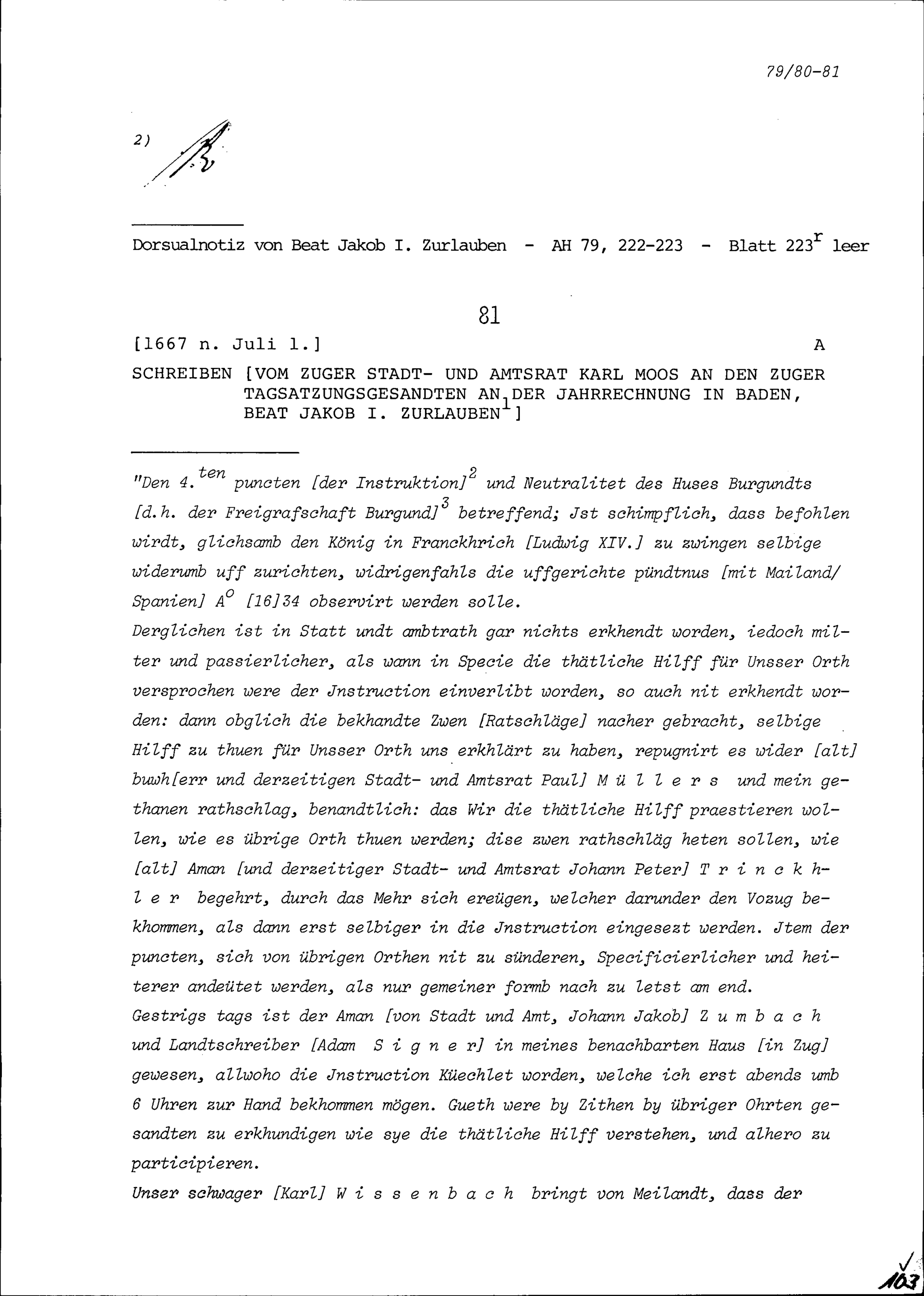 Schreiben von Karl Moos, Stadt- und Amtrat Zug, an Beat Jakob I. Zurlauben, Zuger Tagsatzungsgesandter an der Jahrrechnung in Baden