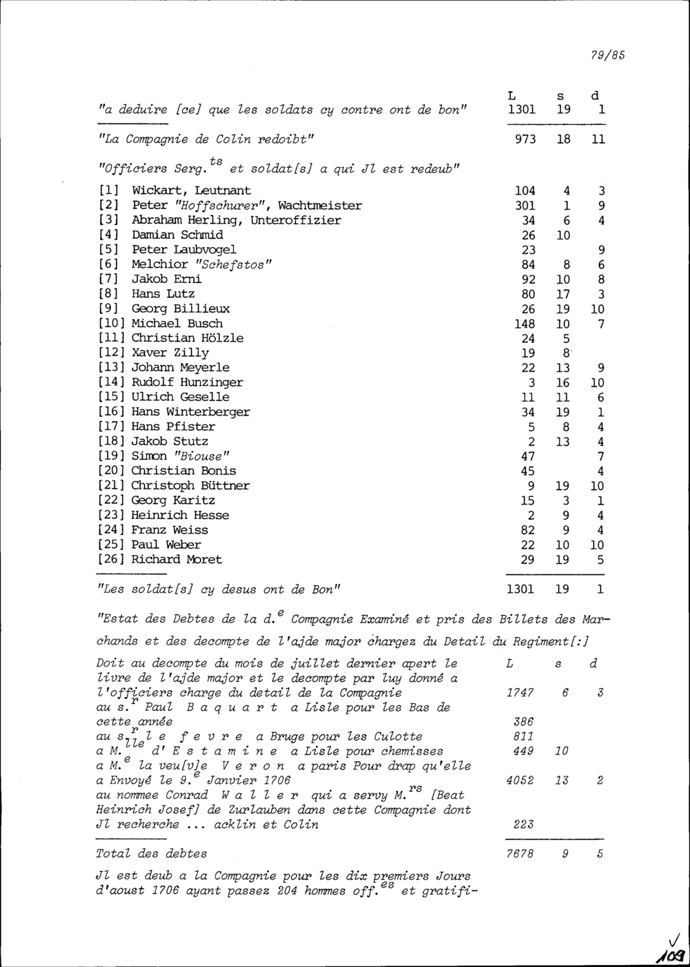 Abrechnung der Offiziere, Sergeanten und Soldaten der Kompanie von Beat Heinrich Josef Zurlauben, Hauptmann, selig, im Schweizer Regiment von Jost Brendlé, Oberst, bis 10. August 1706 und Aufteilung zwischen NN Acklin, Hauptmann, und Felix Oswald Kolin, Hauptmann
