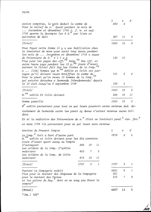 Abrechnung der Offiziere, Sergeanten und Soldaten der Kompanie von Beat Heinrich Josef Zurlauben, Hauptmann, selig, im Schweizer Regiment von Jost Brendlé, Oberst, bis 10. August 1706 und Aufteilung zwischen NN Acklin, Hauptmann, und Felix Oswald Kolin, Hauptmann