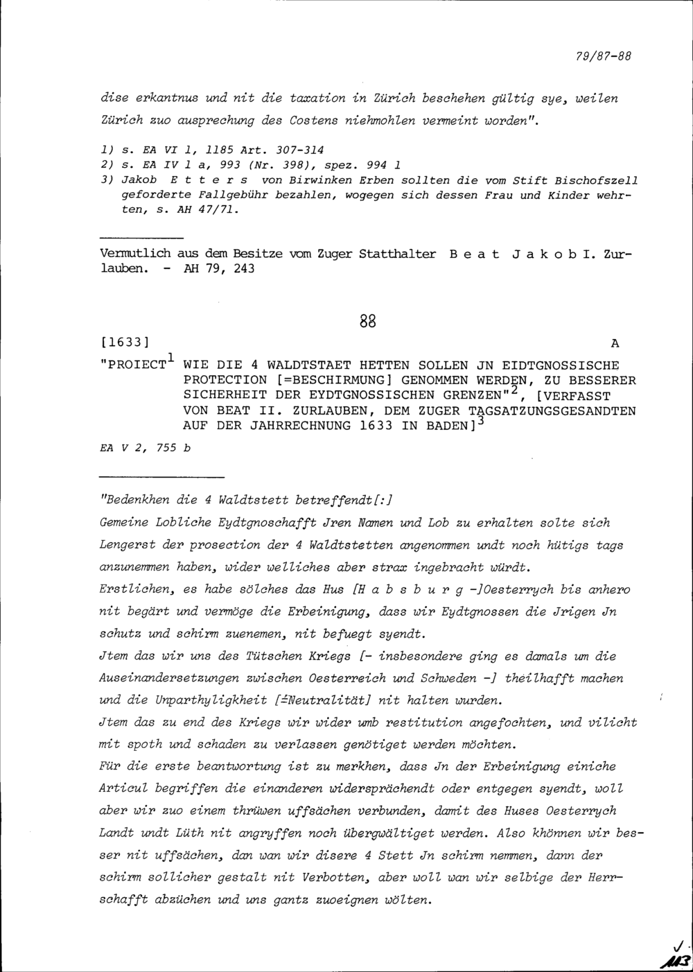 Entwurf, was die Vier Waldstätte zur besseren Sicherheit der Grenzen vorkehren sollten, verfasst von Beat II. Zurlauben, Zuger Tagsatzungsgesandter auf der Jahrrechnung 1633 in Baden