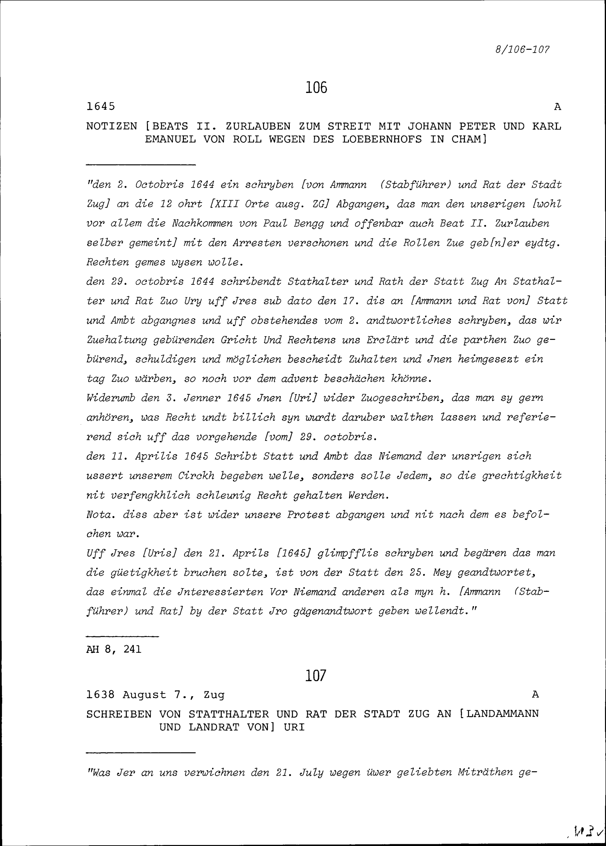 Notiz von Beat II. Zurlauben zum Streit mit Johann Peter und Karl Emanuel von Roll wegen des Löbernhofs in Cham