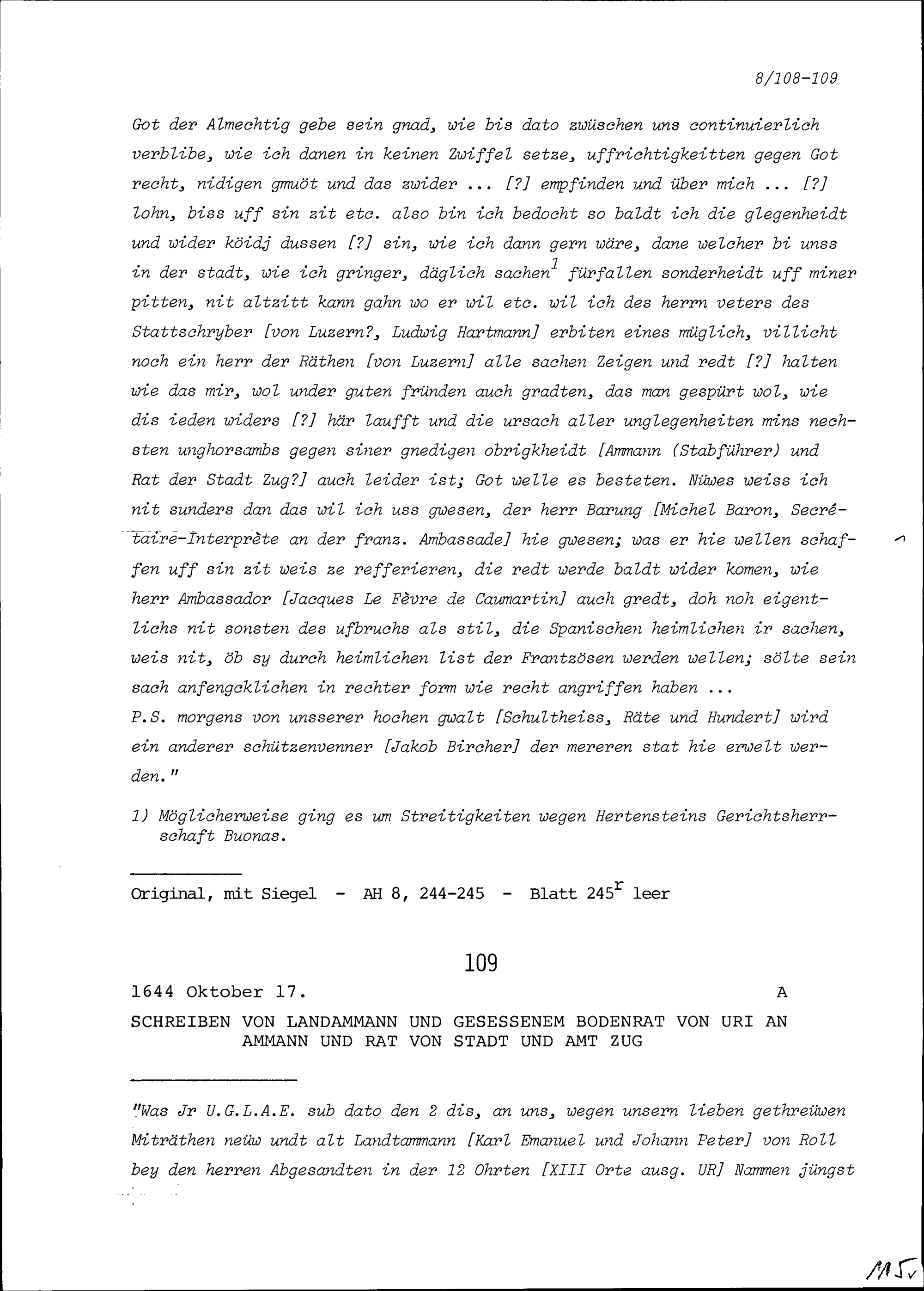 Schreiben des Landammanns und Bodenrats Uri an Ammann und Rat von Stadt und Amt Zug