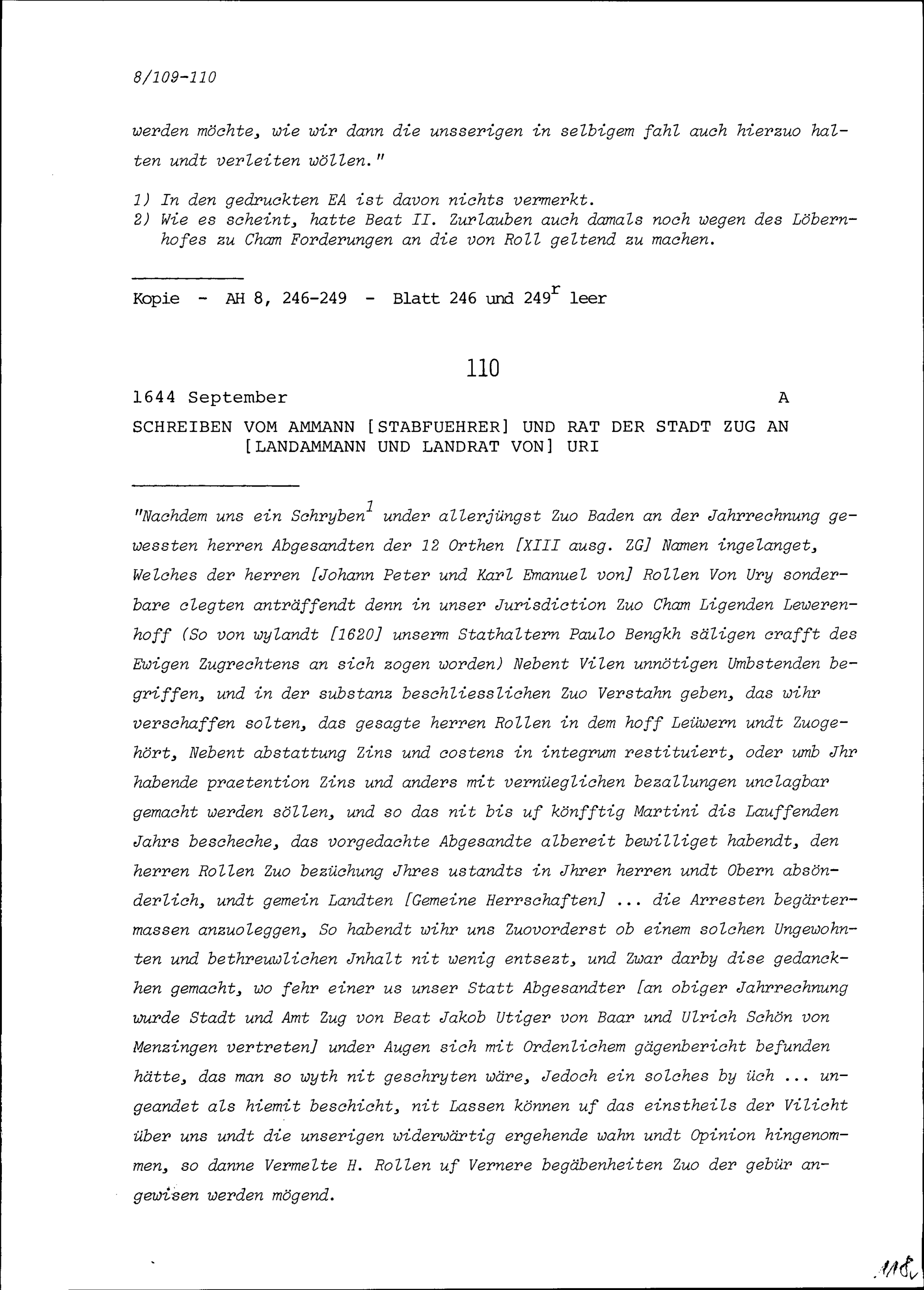 Schreiben des Ammanns (Stabführers) und Rats der Stadt Zug an Landammann und Landrat Uri