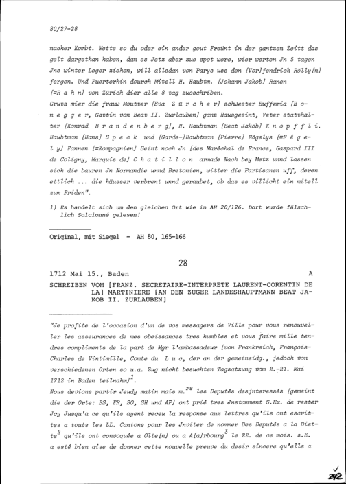 Schreiben von Laurent Corentin de la Martinière, Dolmetscher von Frankreich, an Beat Jakob II. Zurlauben, Zuger Landeshauptmann