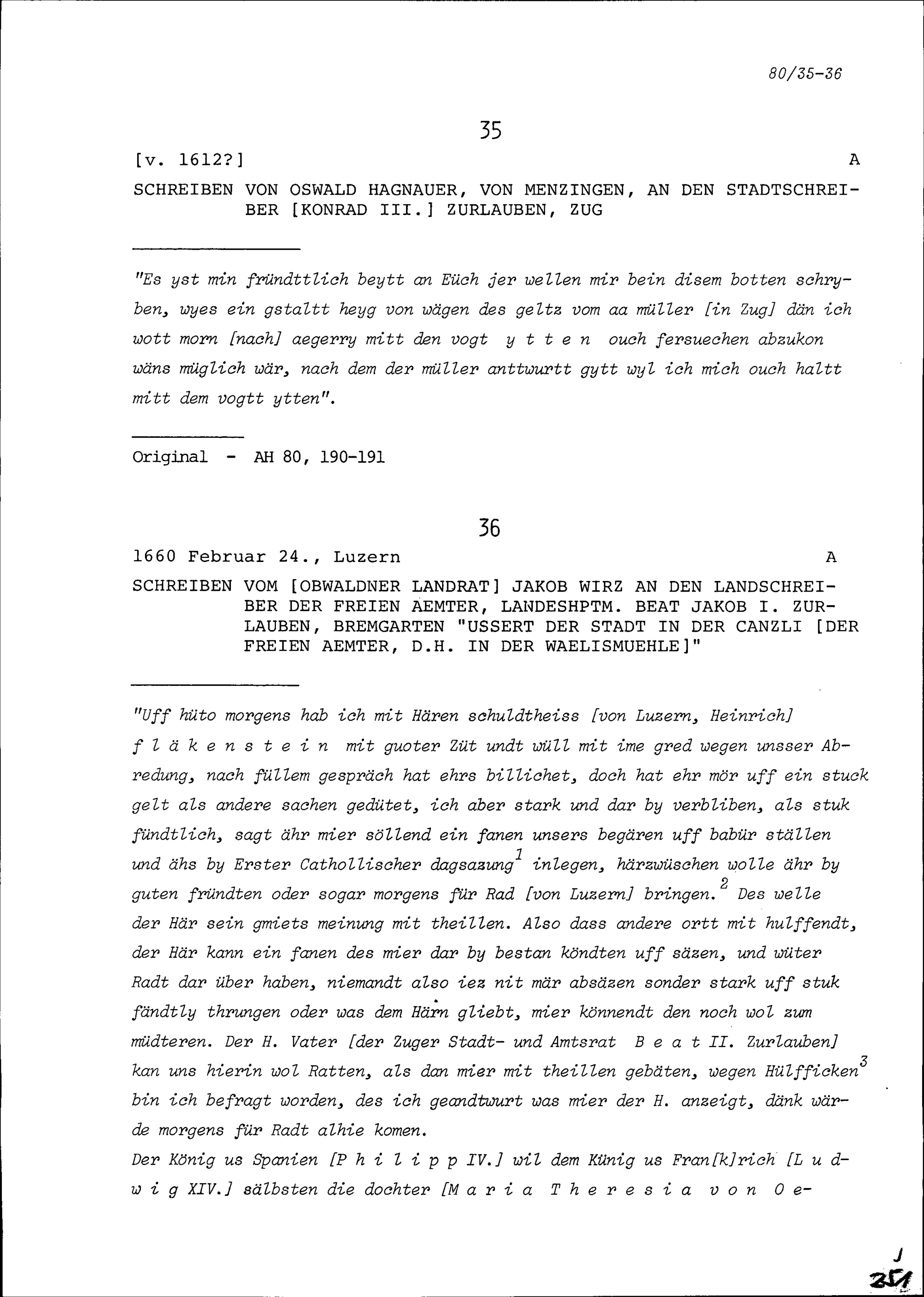 Schreiben von Oswald Hagnauer von Menzingen an Konrad III. Zurlauben, Stadtschreiber, Zug