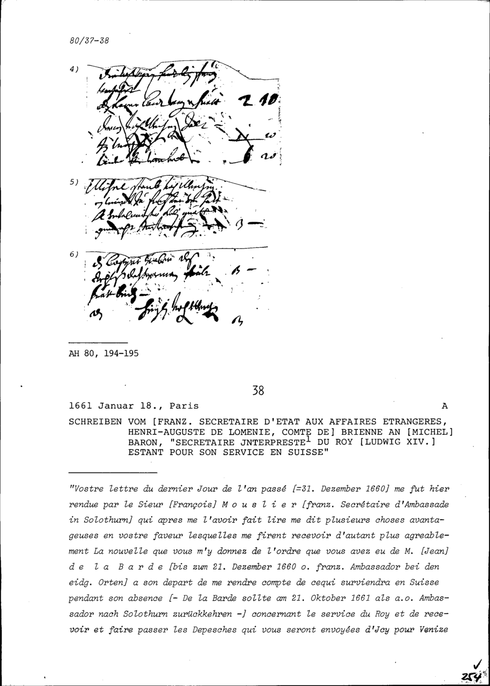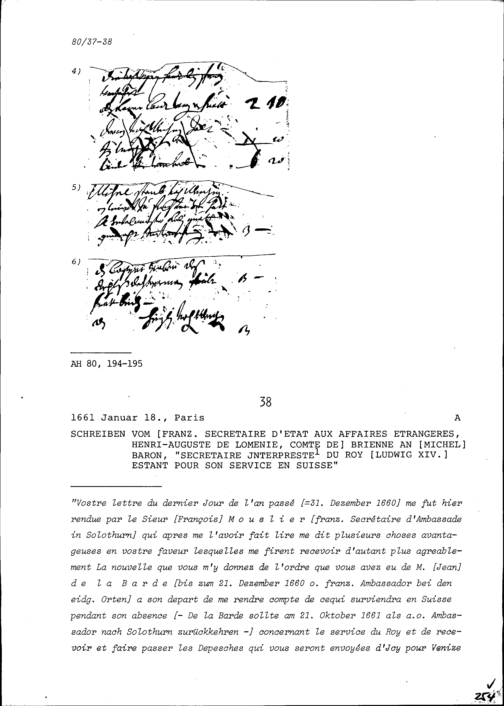 Schreiben von Henri-Auguste de Loménie, Comte de Brienne, französischer Geschäftsträger für Auswärtiges an Michel Baron, französischer Dolmetscher