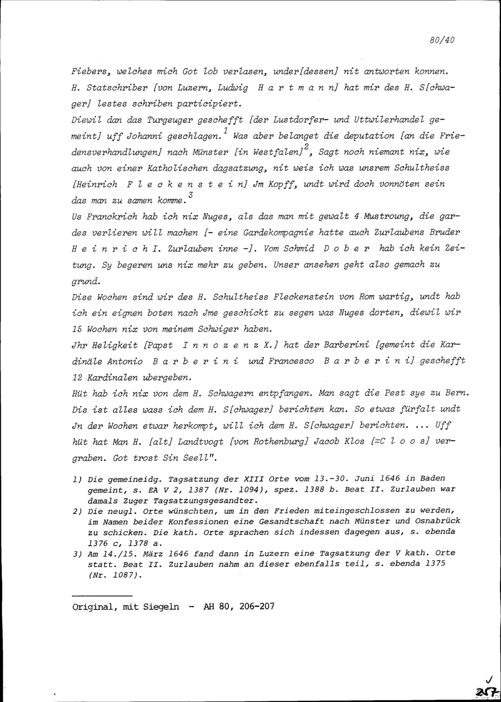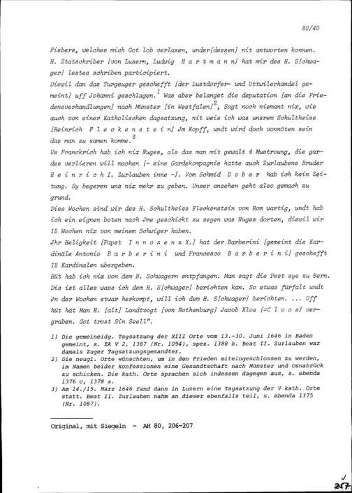Schreiben von Kaspar Pfyffer, Luzerner Ratsherr, an Beat II. Zurlauben, Altammann...