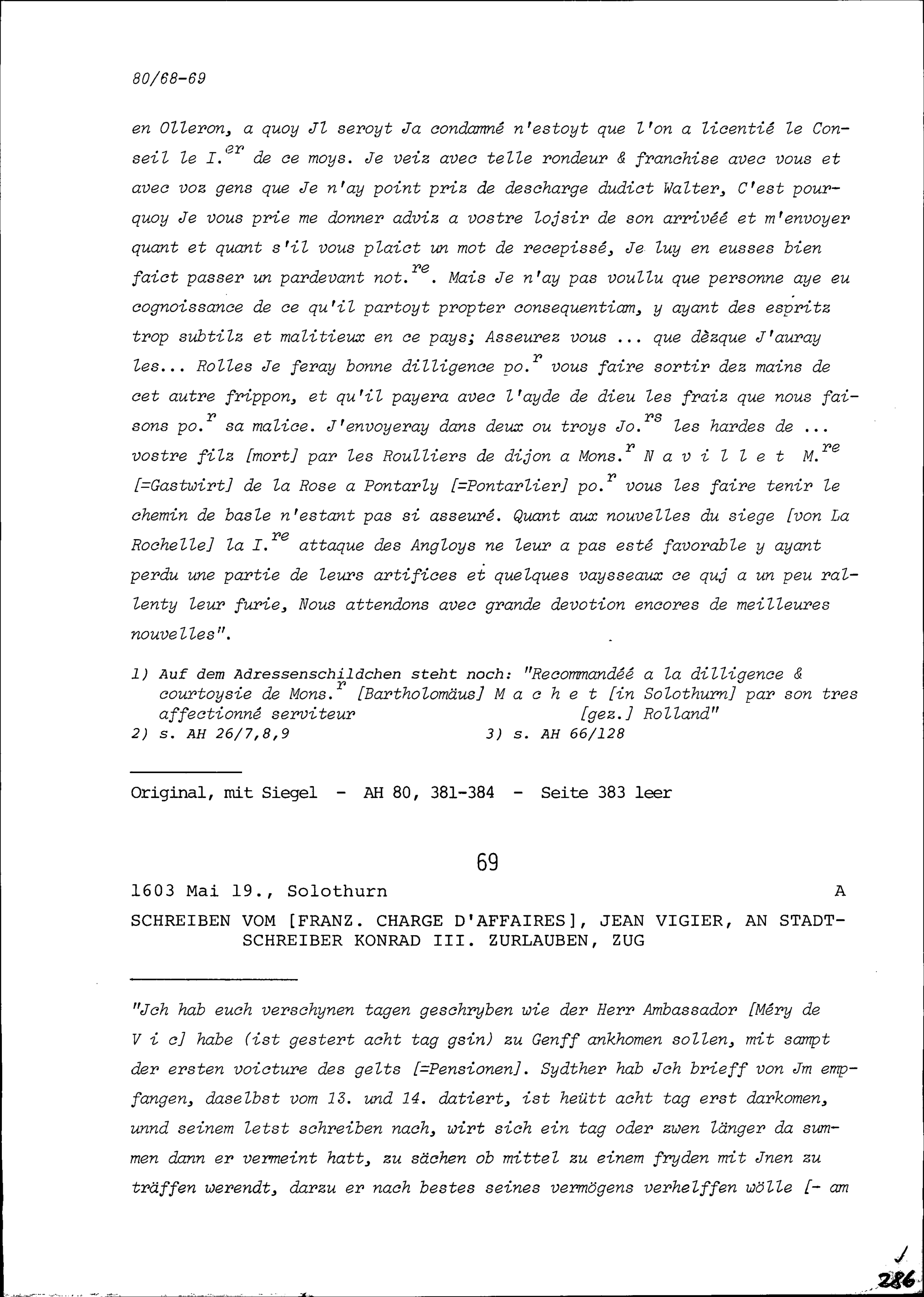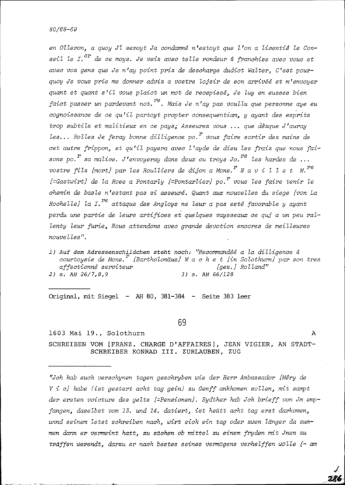 Schreiben von Jean Vigier, französischer Geschäftsträger (Charge d'affaires), an Konrad III. Zurlauben, Stadtschreiber, Zug