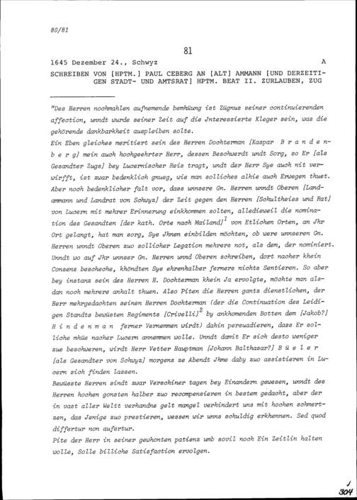 Schreiben von Paul Ceberg, Hauptmann, an Beat II. Zurlauben, Hauptmann und Stadt-...