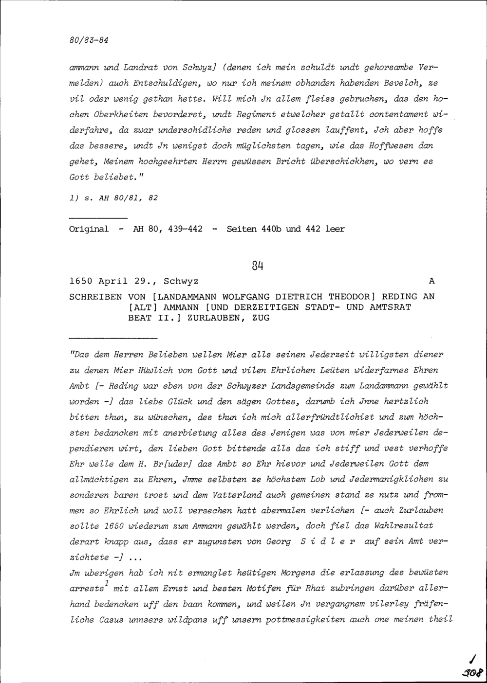 Schreiben von Wolfgang Dietrich Theodor Reding, Landammann, an Beat II. Zurlauben,...