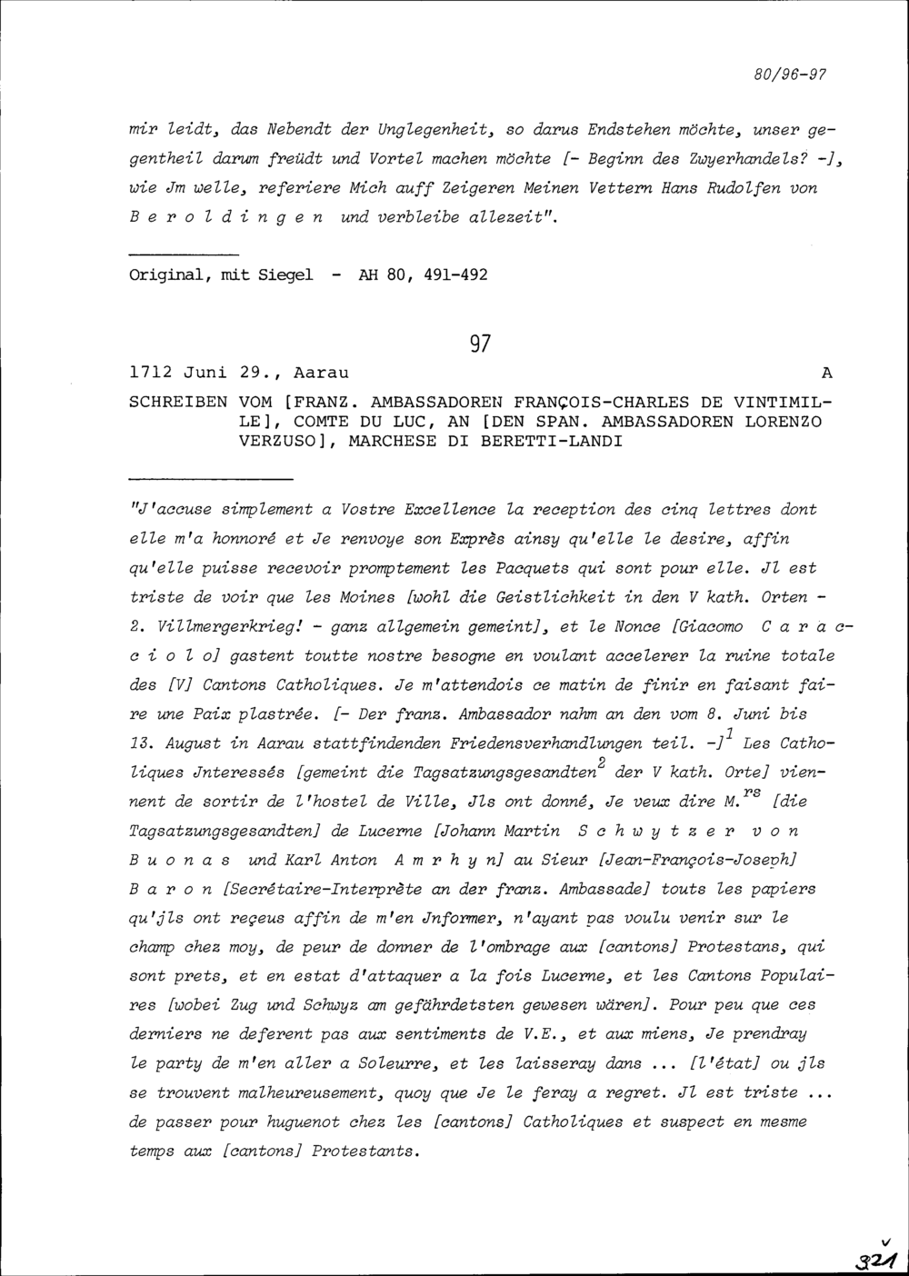 Schreiben von François-Charles de Vintimille, Graf du Luc, Ambassador von Frankreich, an Lorenzo Verzuso, Marchese di Beretti-Landi, Ambassador von Spanien
