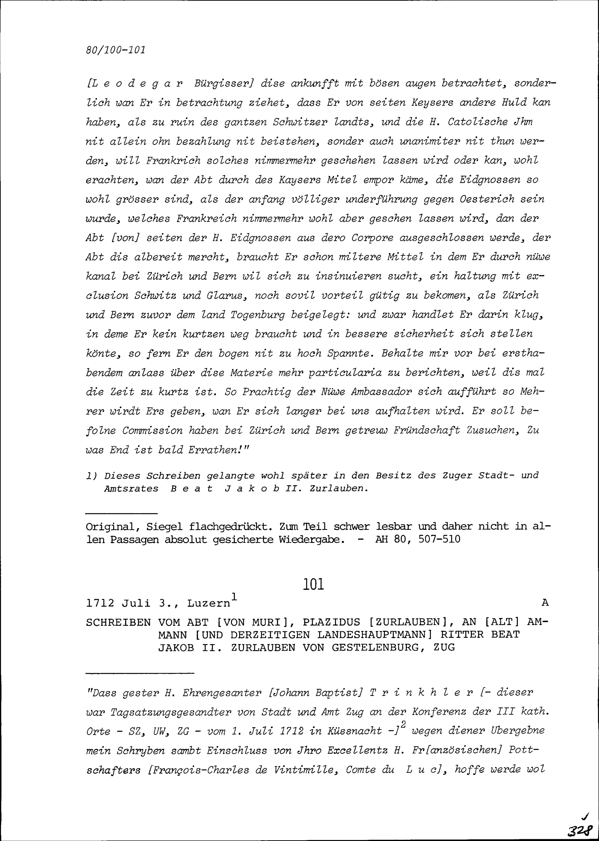 Schreiben von Plazidus Zurlauben, Abt von Muri, an Beat Jakob II. Zurlauben, Altammann und Landeshauptmann, Zug