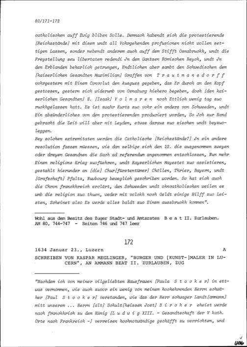 Schreiben von Kaspar Meglinger, Kunstmaler in Luzern, an Beat II. Zurlauben, Ammann, Zug