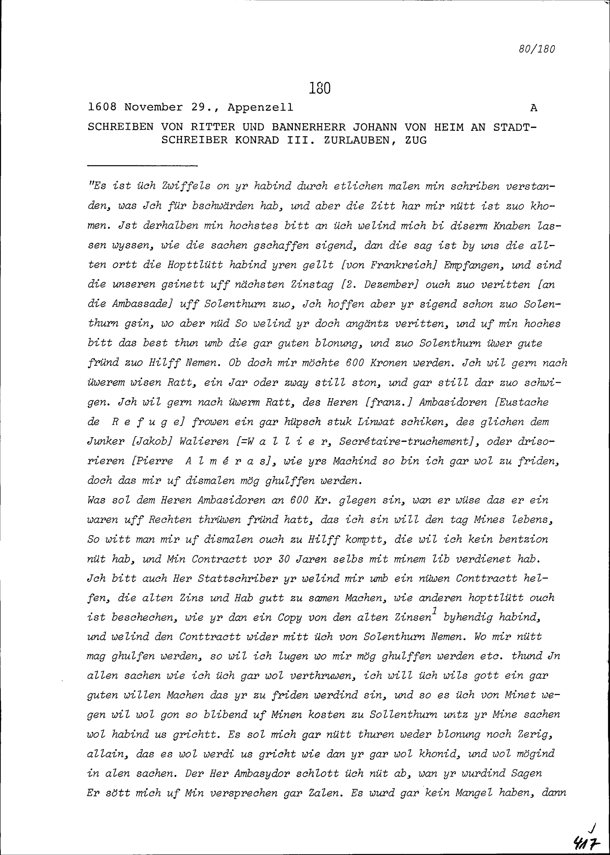 Schreiben von Johann von Heim, Bannerherr Appenzell-Innerrhoden, an Konrad III. Zurlauben, Stadtschreiber, Zug