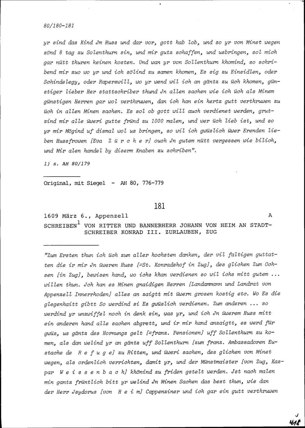 Schreiben von Johann von Heim, Bannerherr Appenzell-Innerrhoden, an Konrad III. Zurlauben, Stadtschreiber, Zug